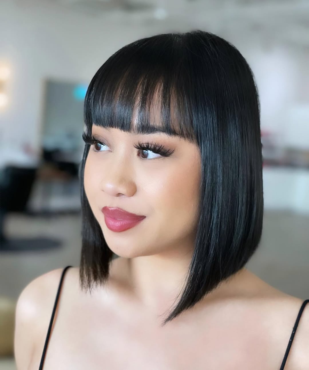 We love this gorgeous angled bob haircut for its extremely long layers at the front that look chic and edgy at the same time. It’s a great match for straight dark hair.