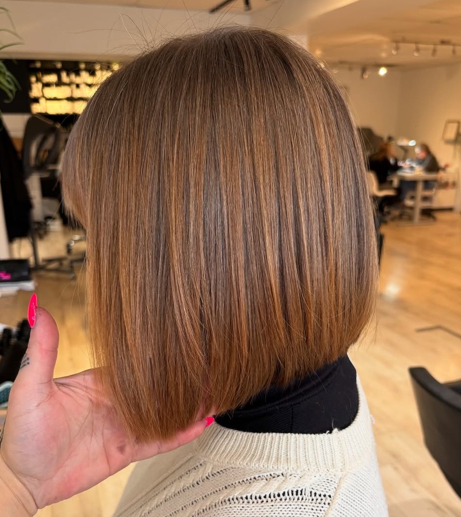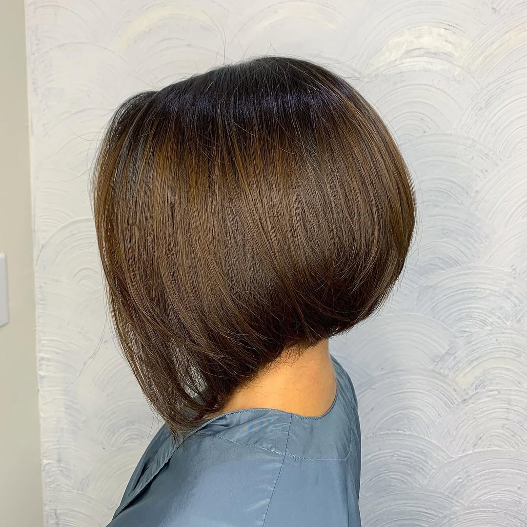 Angled bob hairstyles don’t always have to rely on sharp and dramatic cuts to be modern and trendy. Only a little longer in the front than the back, it’s a big enough difference to count. The slanting lines mixed with subtle layers give it volume, while highlights throughout enhance the appearance of depth.