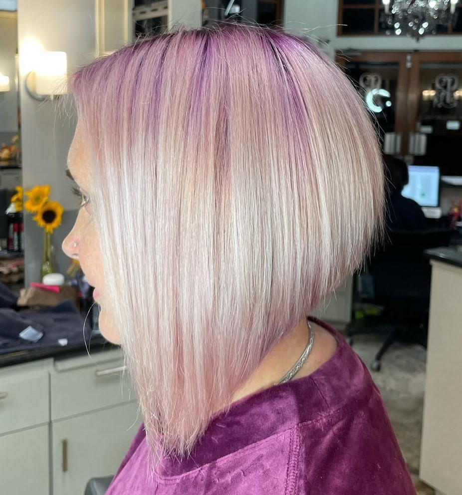 Beautiful shades of magenta and violet spruce up this sleek angled bob. The subtle, gradient dye job creates a serious visual interest, with the darker, stacked back enhancing the depth and drama of the asymmetrical cut.