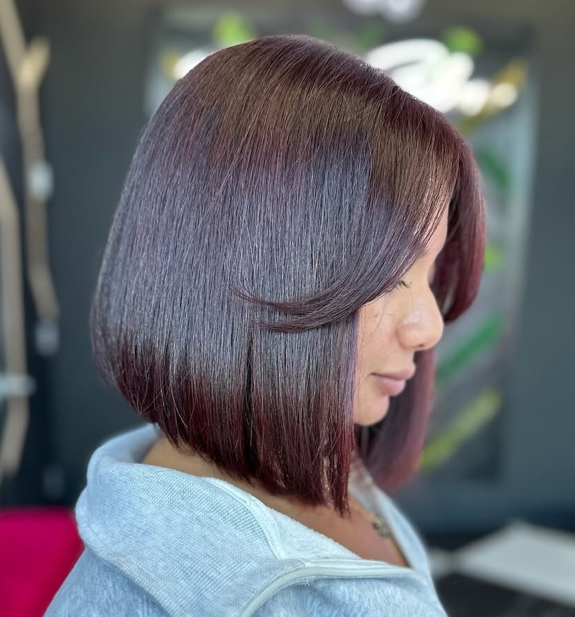 This cool asymmetrical bob with side bangs can be your best choice if you have a round face shape. Also, the subtle layers towards the ends cause the asymmetry to look much more dramatic! This is what you want when you are trying to make a fashion statement.