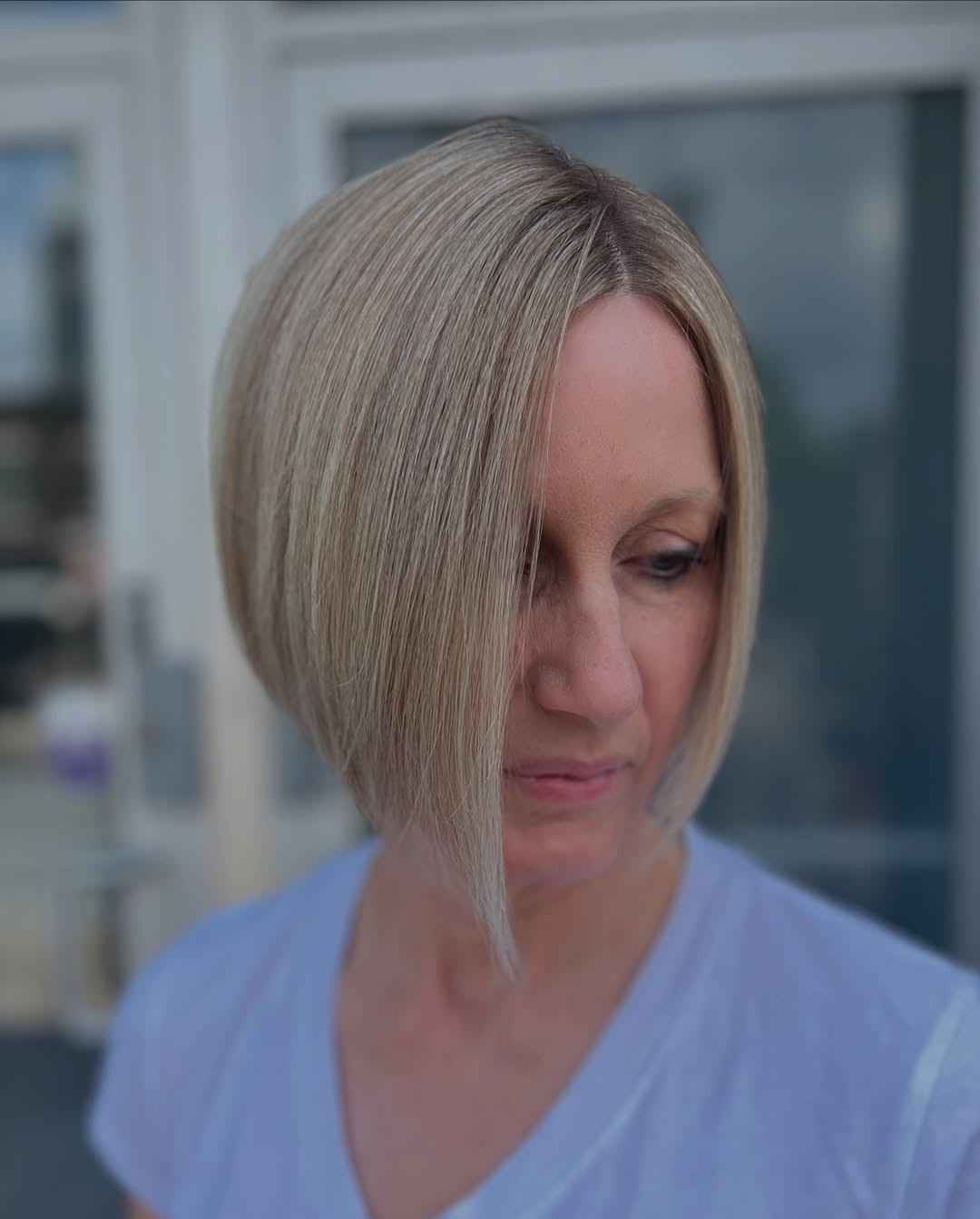 Angled lob is the best compromise between long hair and a modern cut. Blonde shoulder-length bob with dark roots looks incredibly hot and chic.