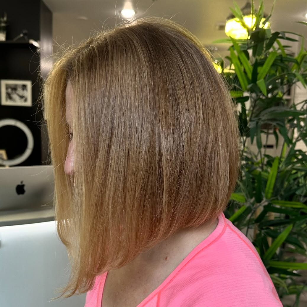 For a new, edgy look that is sophisticated and ready for anything, try this gorgeous lob. A very steep angle shoots down and towards the front, while the smooth nape features the flaring line of the back.