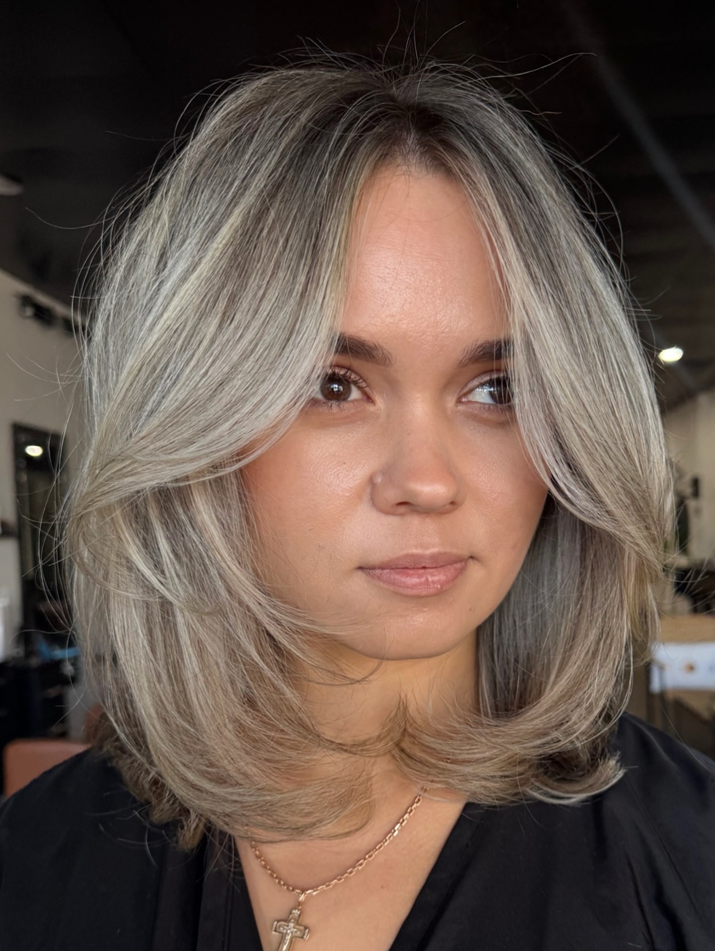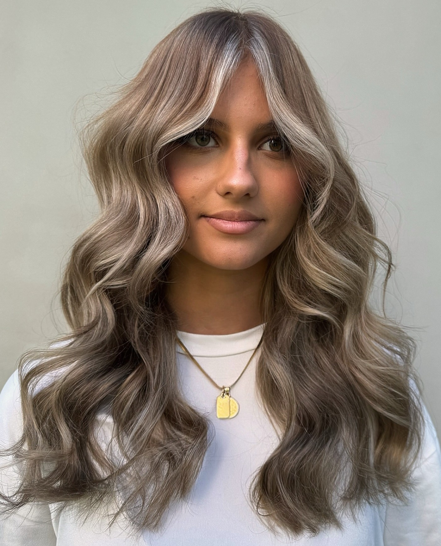 If it’s a modern take on the ash blonde look that you want, then this is the look for you. With just the right amount of edge – brunette, ash blonde and gray tones come together to create this eye-catching hair color. The finishing touch is slight beach waves that perfectly complement the long straight fringe.