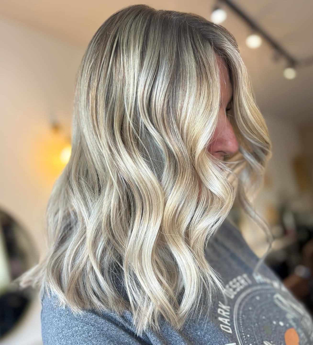 If you like brightness just at your tips, consider merging two shades of medium ash blonde. The edge where the colors meet is blurred. The rippled texture further diminishes the demarcation, creating harmony and flow.
