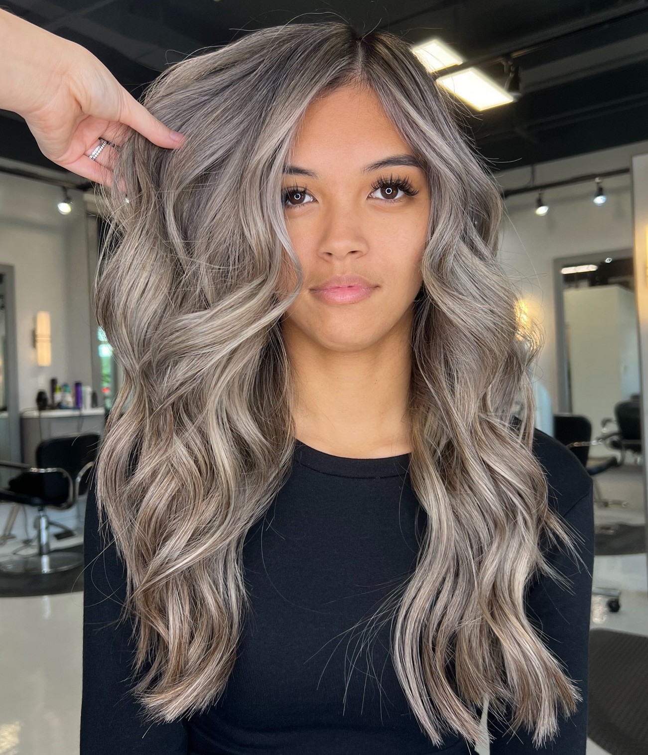 Light ashy highlights look astonishing on long wavy hair as they bring texture and dimension to brown hair colors. Besides, you don’t need to lighten your roots every time you refresh your balayage.