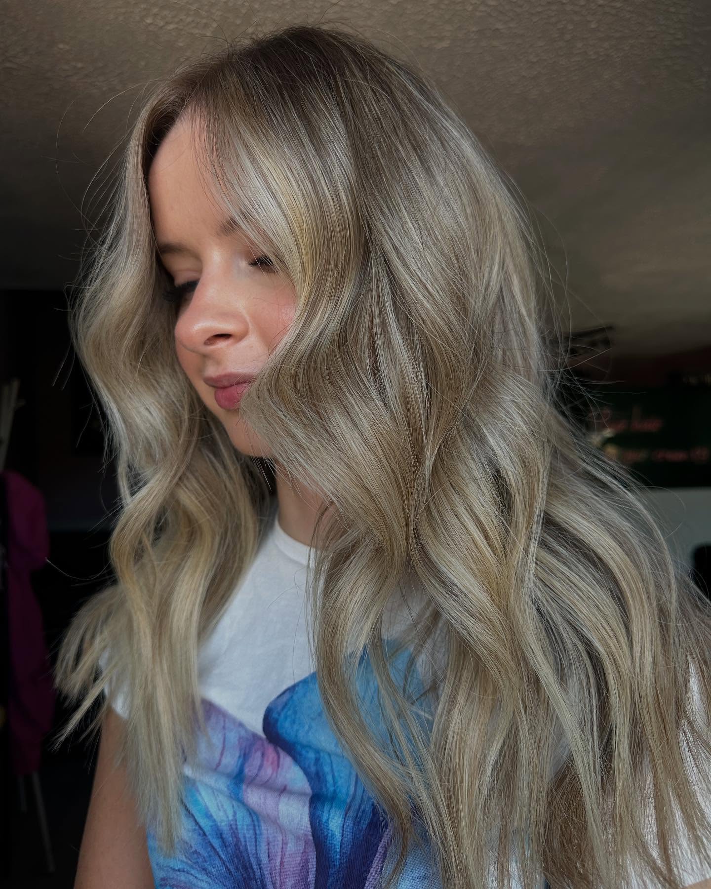 If you love grunge, this dirty blonde with some ash blonde hair dye mixed in is the alternative perfection, neither too bright nor too gloomy. Loose ripples and feathery ends enhance the 90s gritty vibe. Pair with neutral makeup and minimalist fashion. For example, the sheer black top and delicate choker pictured.