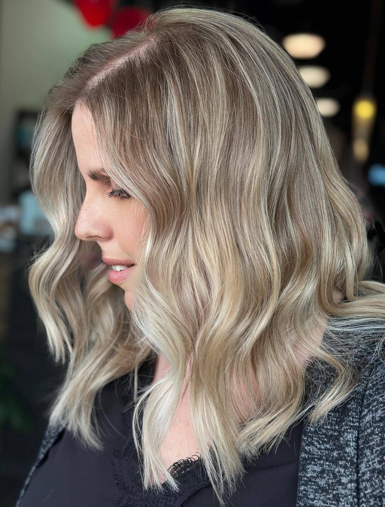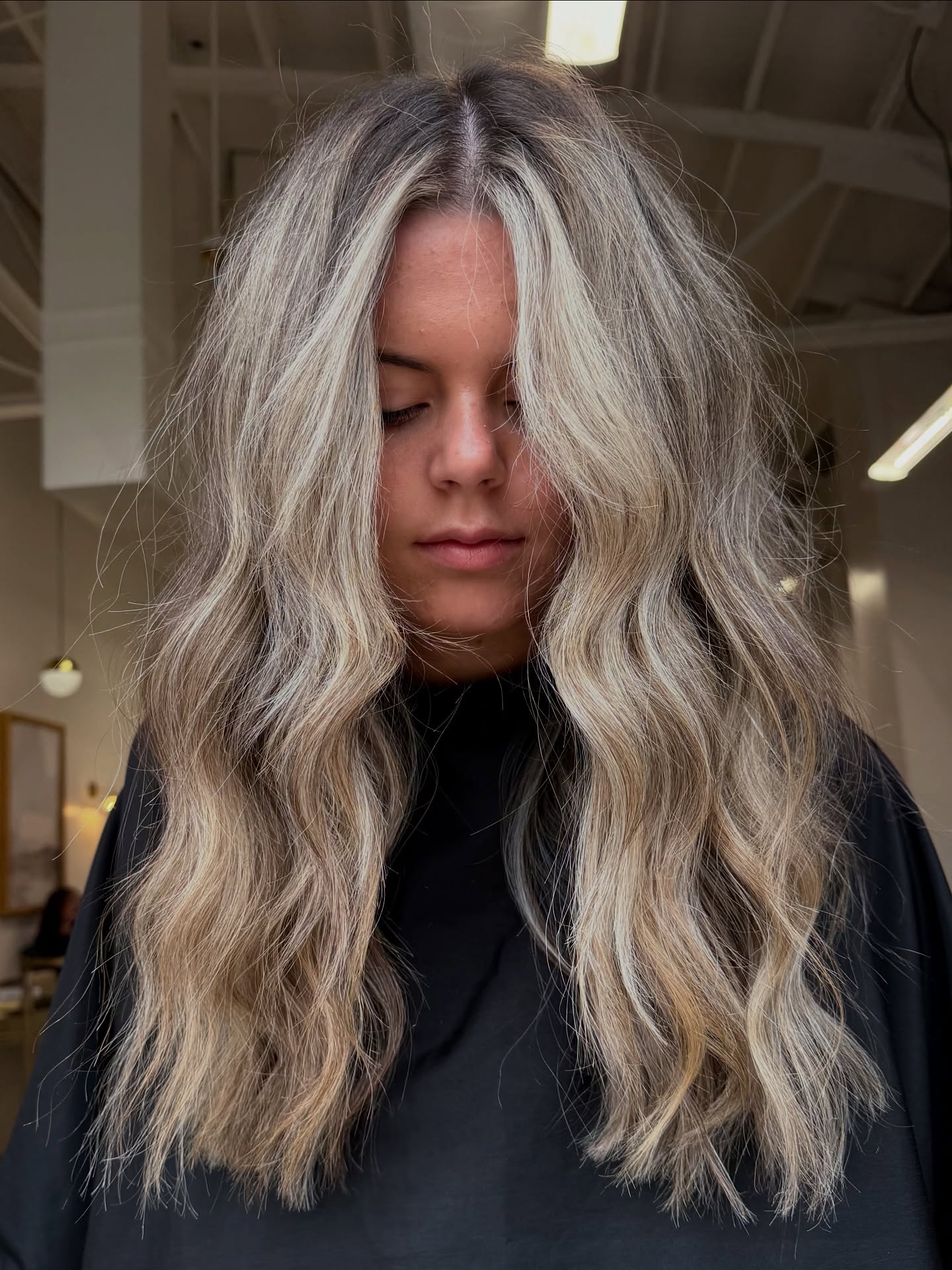 Hair that looks lived in is au courant. The grown-out aesthetic makes tones that were once high-maintenance much more accessible. Cool-toned platinum hair actually appears brighter with ash highlights and dark brown roots; the contrast makes it pop! The messy part adds attitude, while undulations keep it soft.