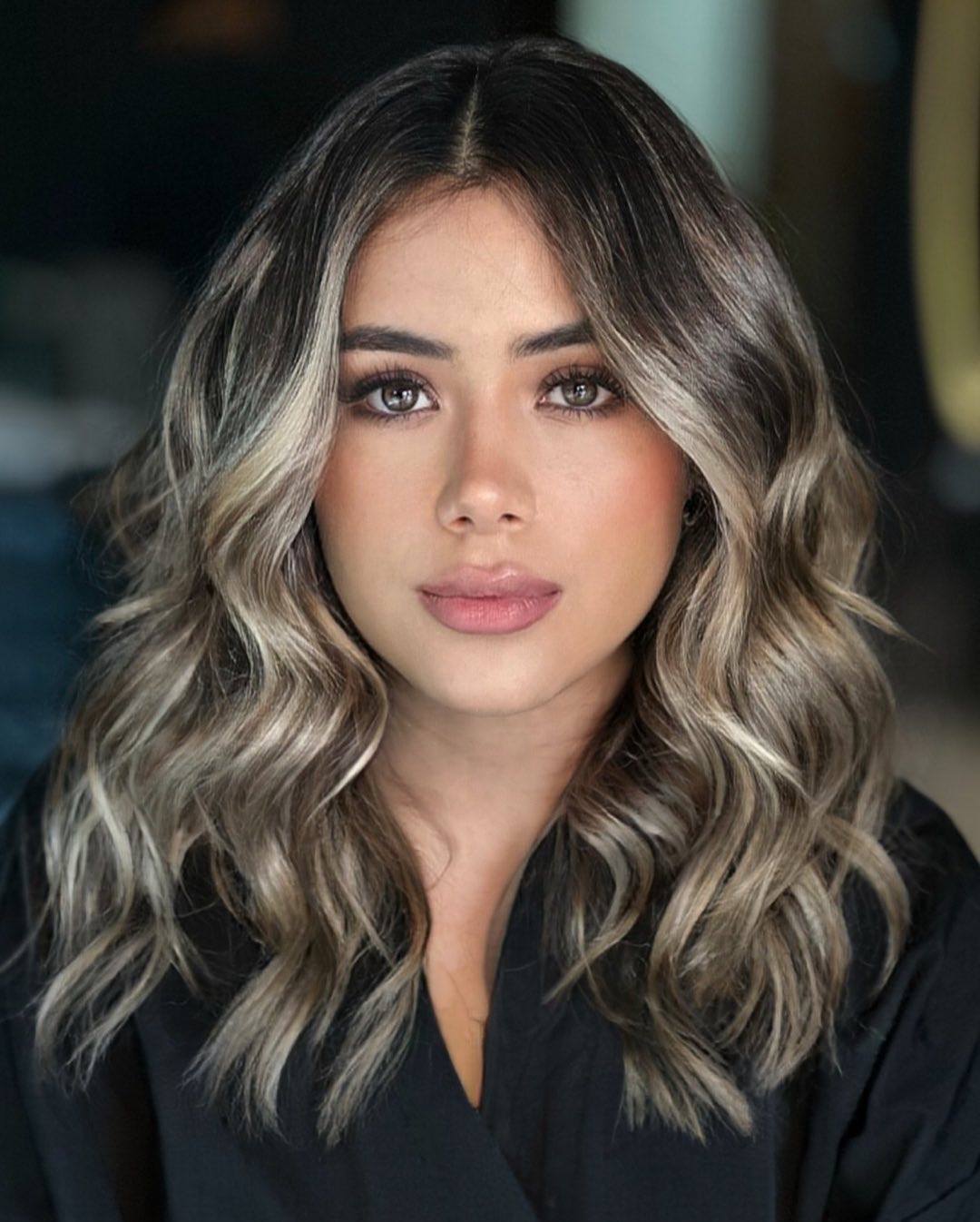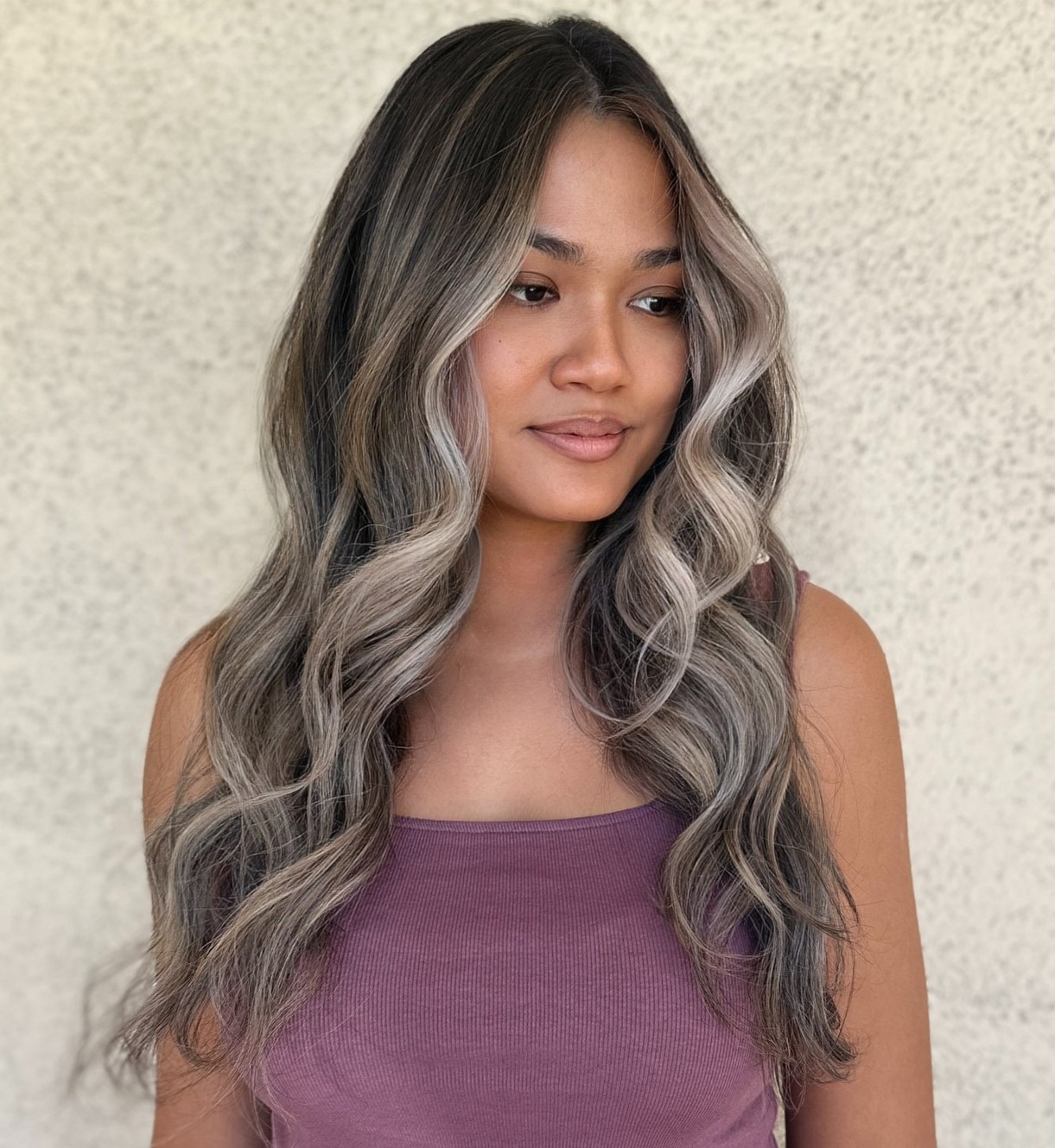 Light ashy highlights look astonishing on long wavy hair as they bring texture and dimension to brown hair colors. Besides, you don’t need to lighten your roots every time you refresh your balayage.
