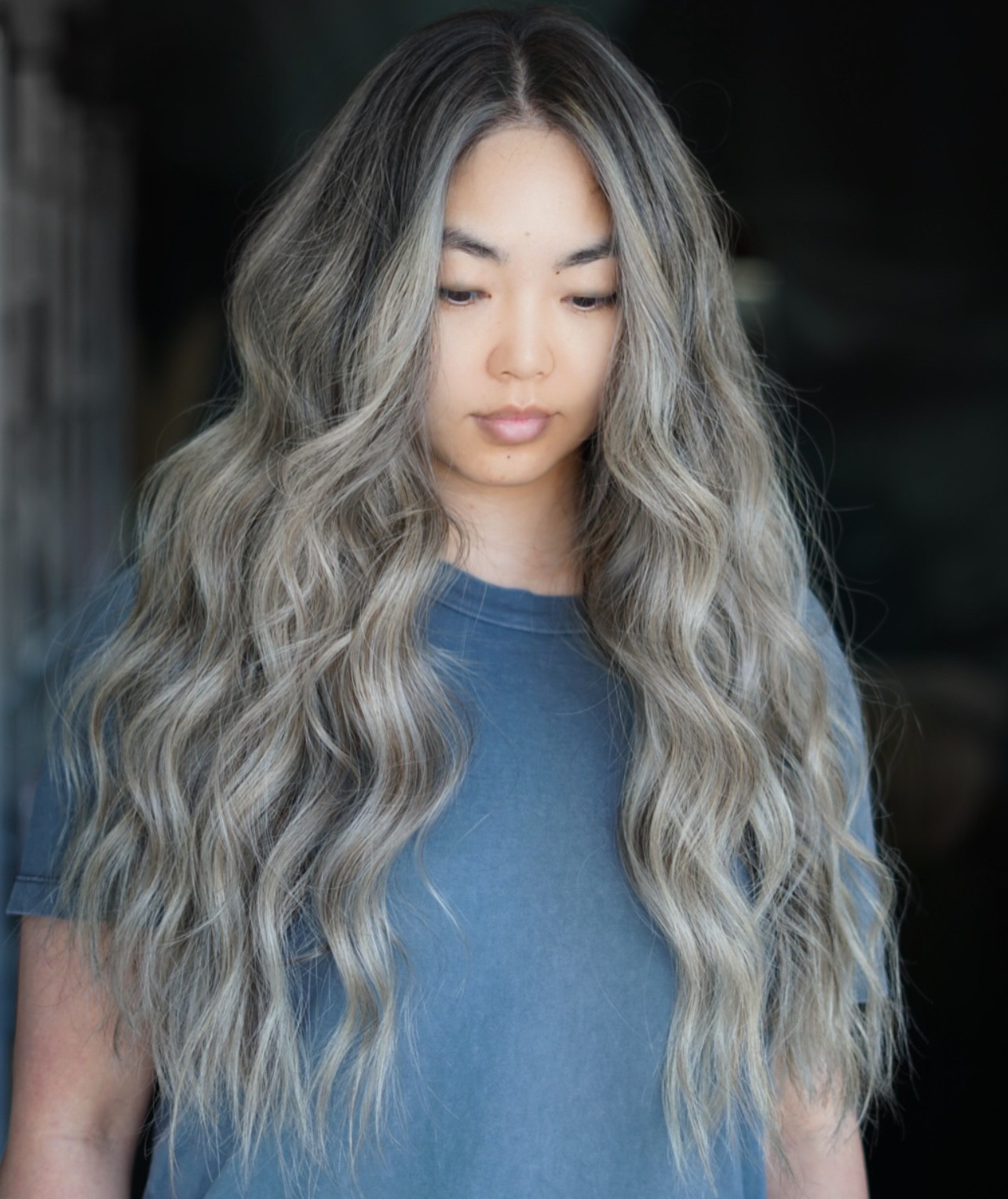 If it’s a modern take on the ash blonde look that you want, then this is the look for you. With just the right amount of edge – brunette, ash blonde and gray tones come together to create this eye-catching hair color. The finishing touch is slight beach waves that perfectly complement the long straight fringe.