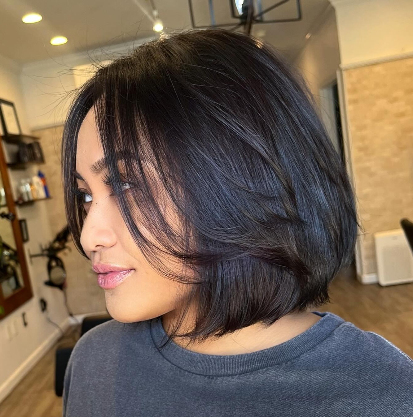 Made popular in the 1970s, shag hairstyles aren’t only still around, but they’re cool-girl approved and a great find for Asian hair styles. Medium layered strands — as opposed to short, wispy layers in the original 70s style cut — will keep it current, as will cute bangs and some fresh highlights.