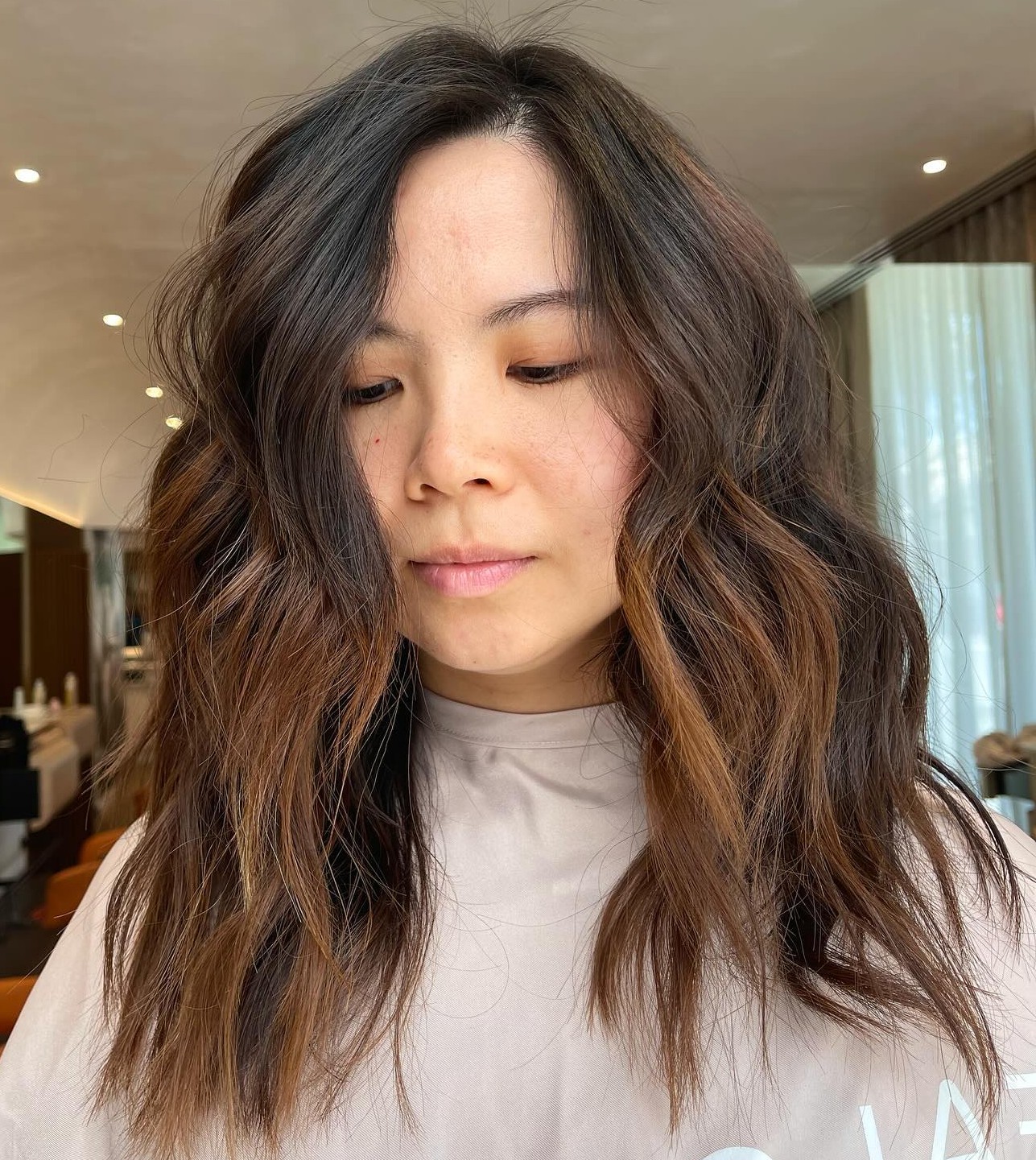 This universally flattering cut is one of the most popular among the trendiest oriental hairstyles and for good reason. Layers through the bottom three-fourths of the hair create a soft texture that when curled into loose waves and highlighted with a touch of babylights looks completely natural and effortless.