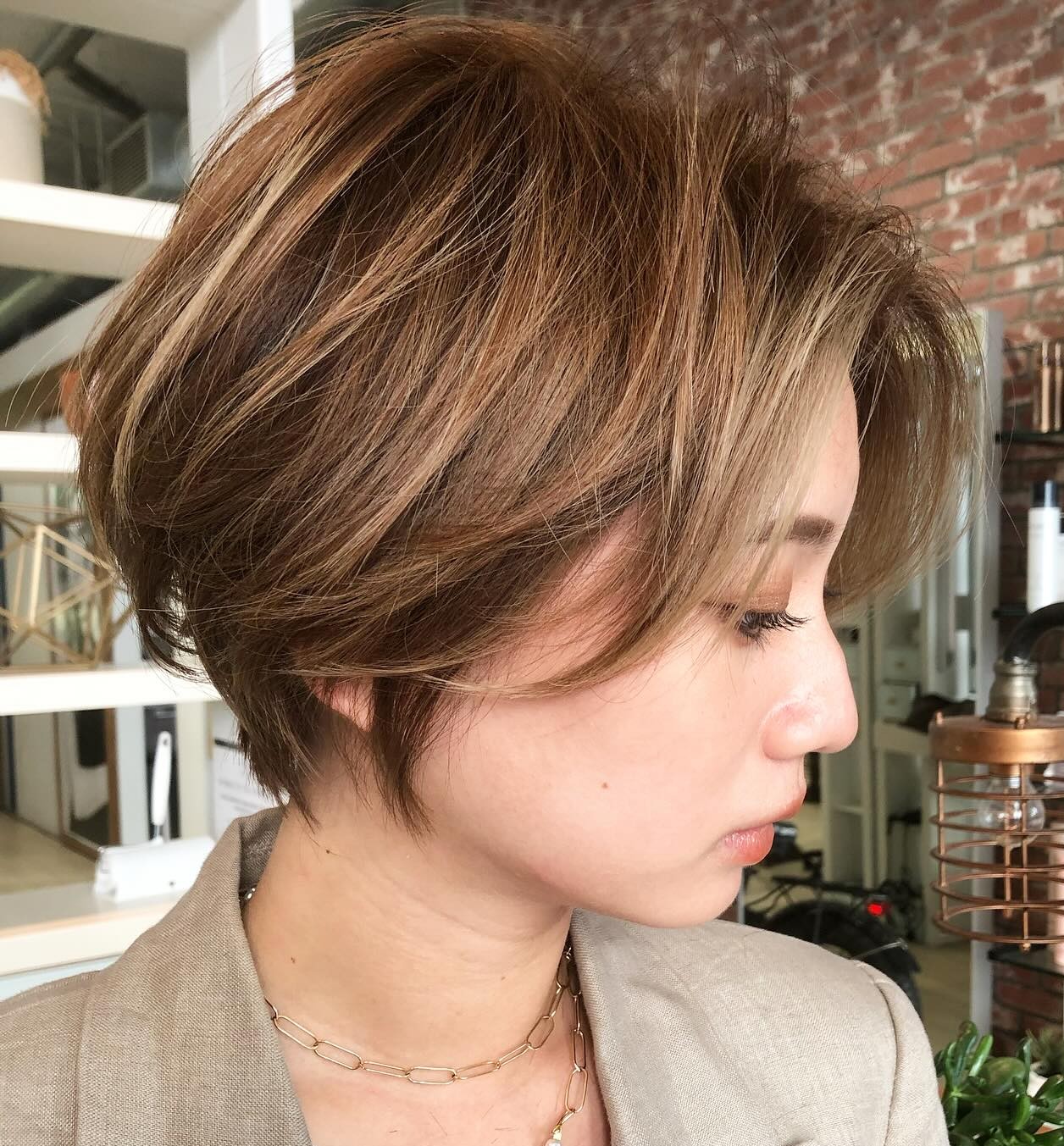 Scroll no further if you’re looking for something casual and low maintenance. This short cut with a side parting is a great option, indeed. Babylights work like magic on fine hair: they provide noticeable highlights that add volume and dynamics.