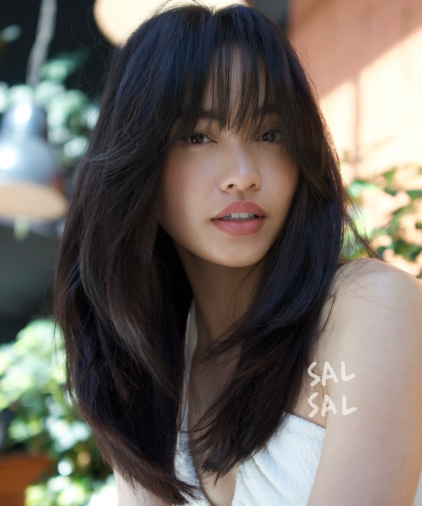 Show off your naturally silky strands with one of the most classic haircuts — a long sleek blunt cut. Side swept bangs paired with one-length hair is super easy to maintain: blow dry with a round brush, add a little shine spray to help tame flyaways, and go.