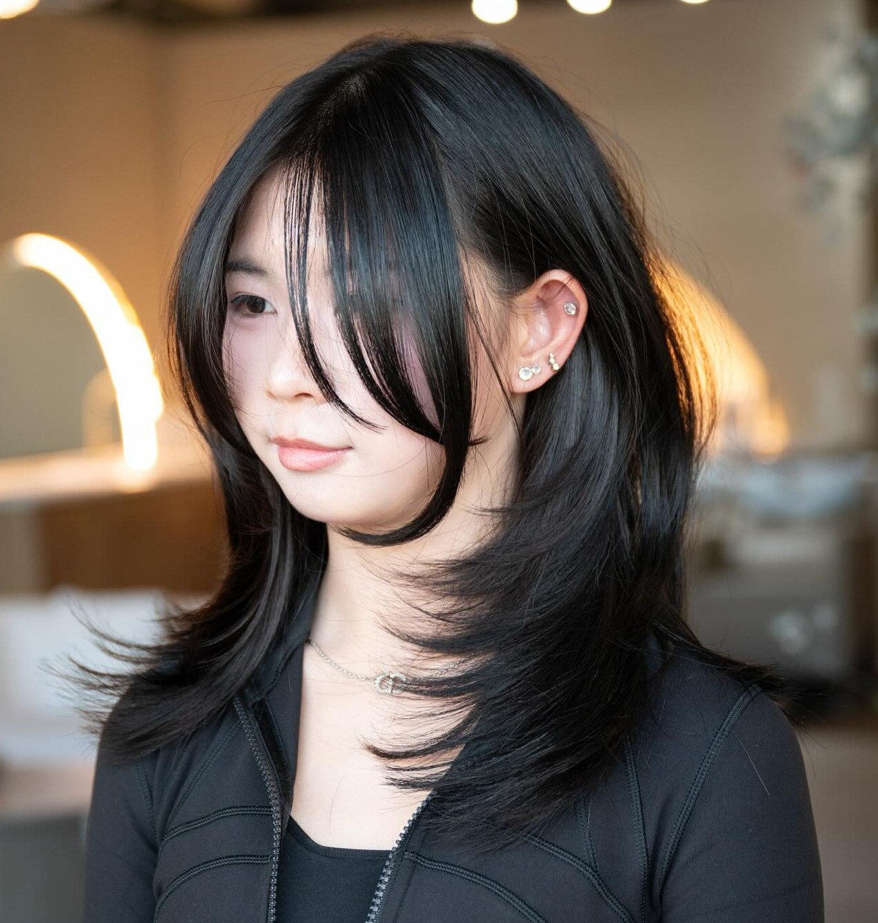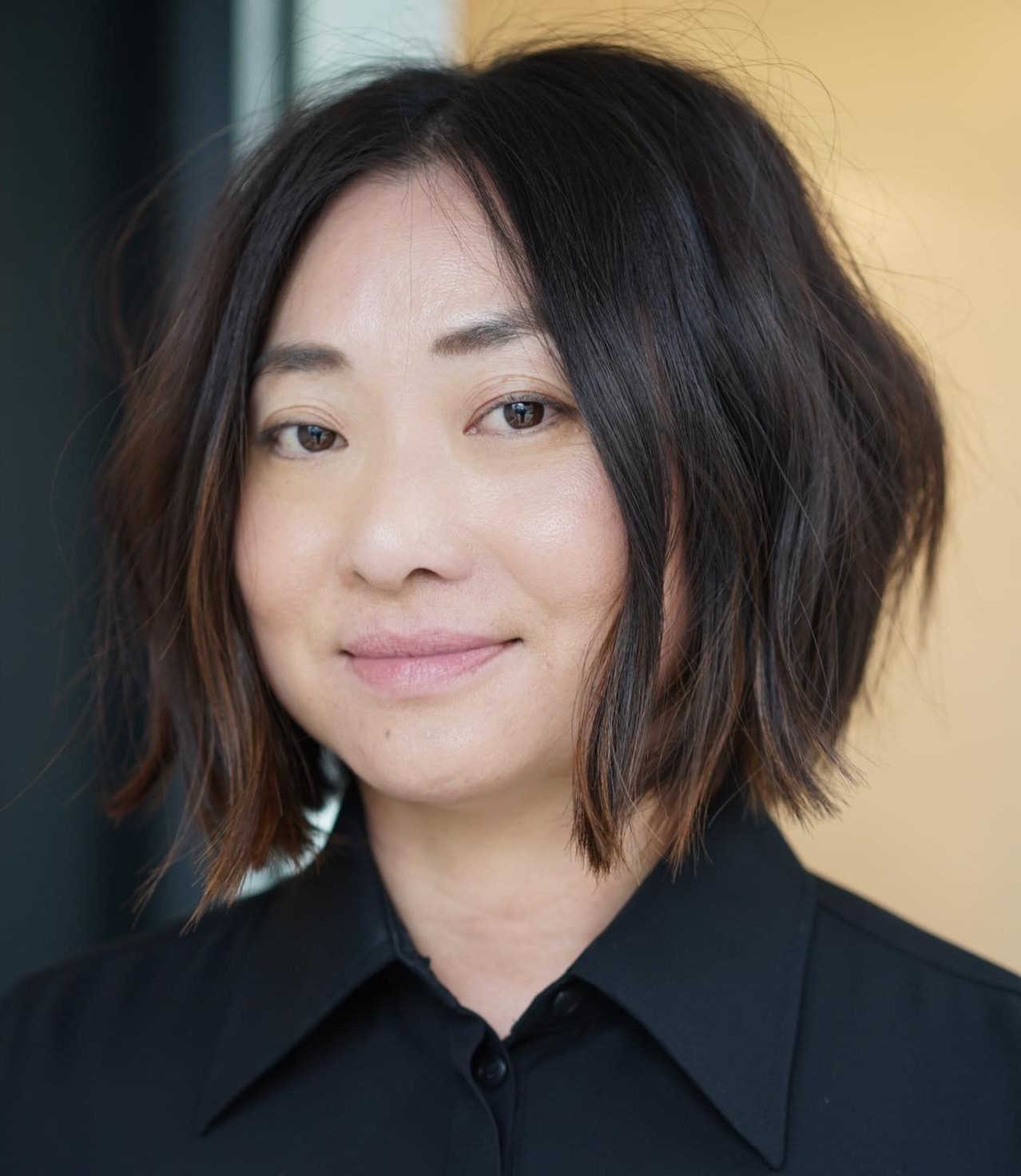 This universally flattering cut is one of the most popular among the trendiest oriental hairstyles and for good reason. Layers through the bottom three-fourths of the hair create a soft texture that when curled into loose waves and highlighted with a touch of babylights looks completely natural and effortless.