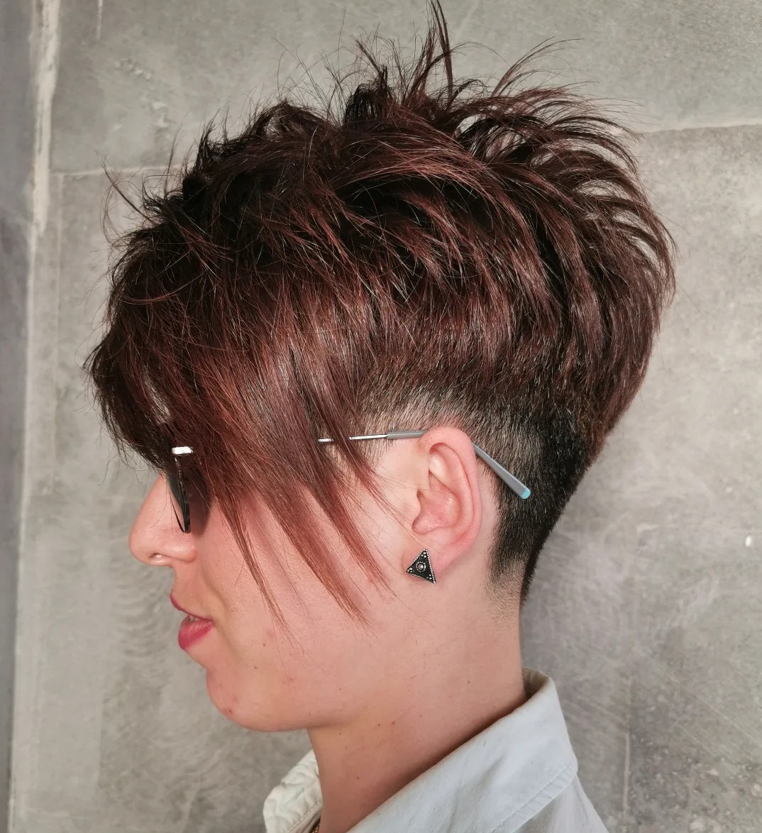 The pixie undercut can go from cute to edgy in a matter of minutes. Take this bold lady’s, fun, sexy and cool look. She’s opted for an extreme undercut on one side and a long, tousled fringe on the other. It’s even laced with some stunning fuchsia highlights. Bright and beautiful.
