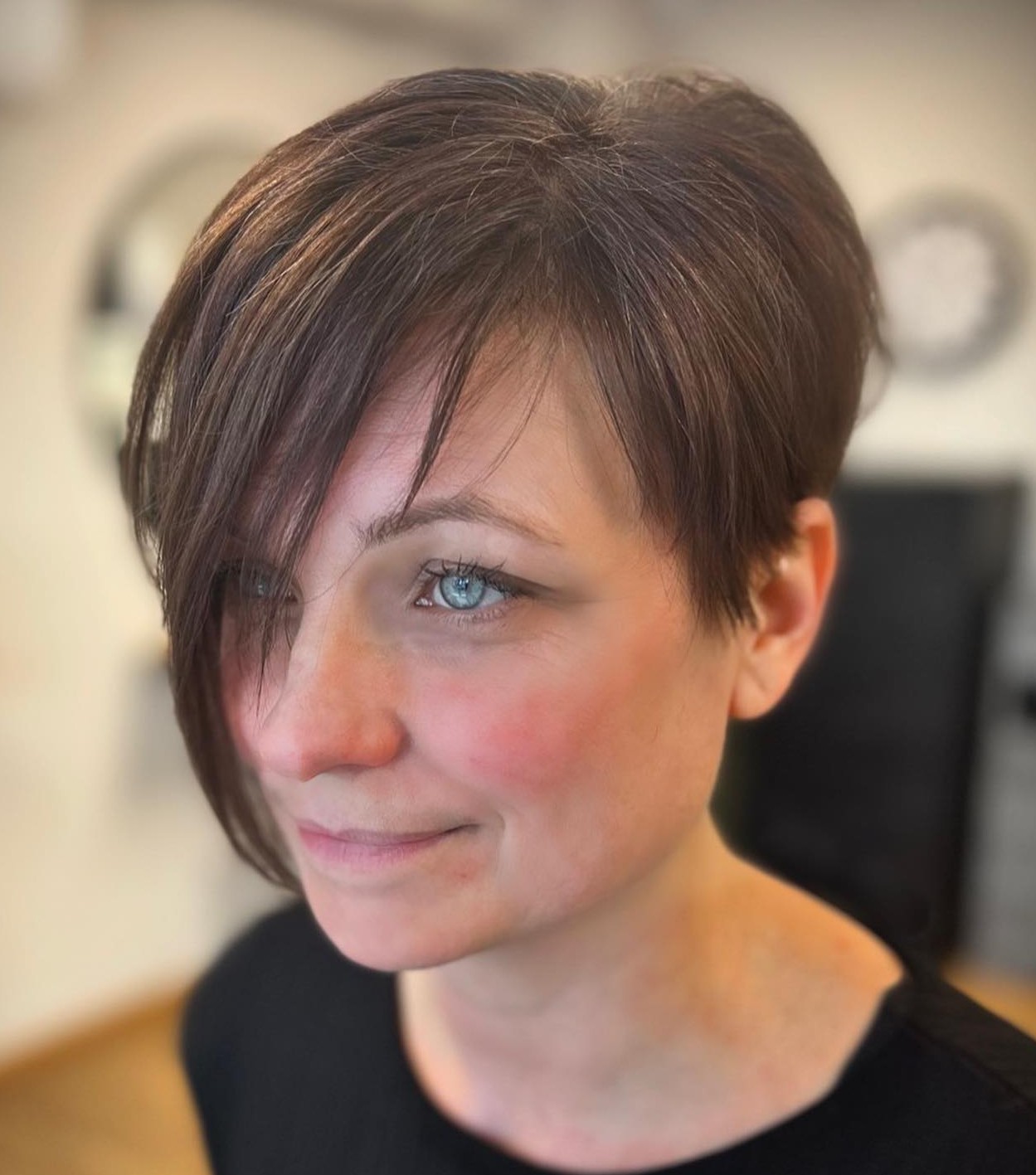 No matter your age or hair type, a deep side parting is the perfect complement to a short asymmetrical pixie. Embrace an extreme part to create full, feminine bangs that can be swept to the side you prefer.