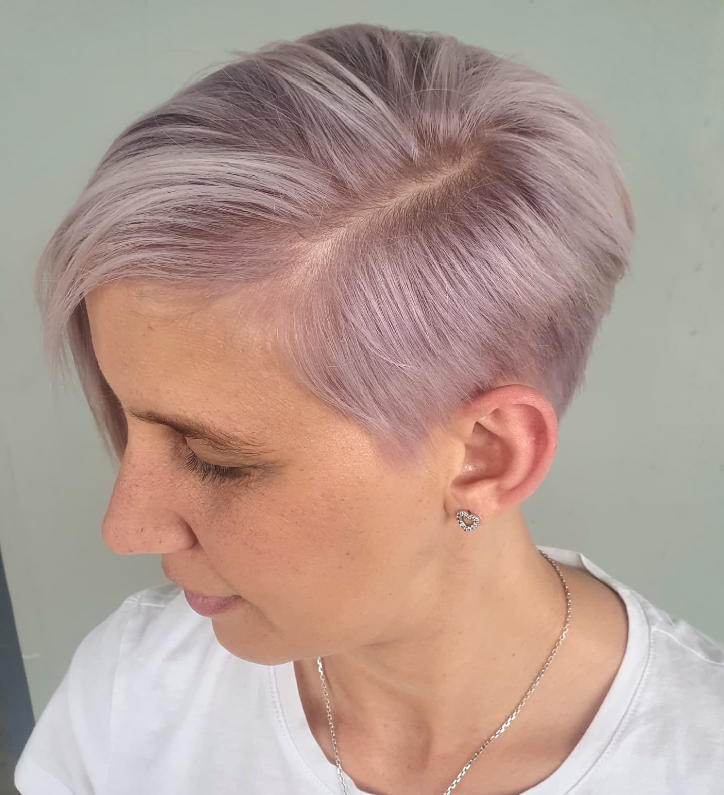 Step away from natural hues and go with something totally artificial, but lovely. Go grey in your 20s, bright blue in your 50s… or anything in between. With cropped sides and longer, side swept locks atop, this style flatters an oval face and really brings out facial features.