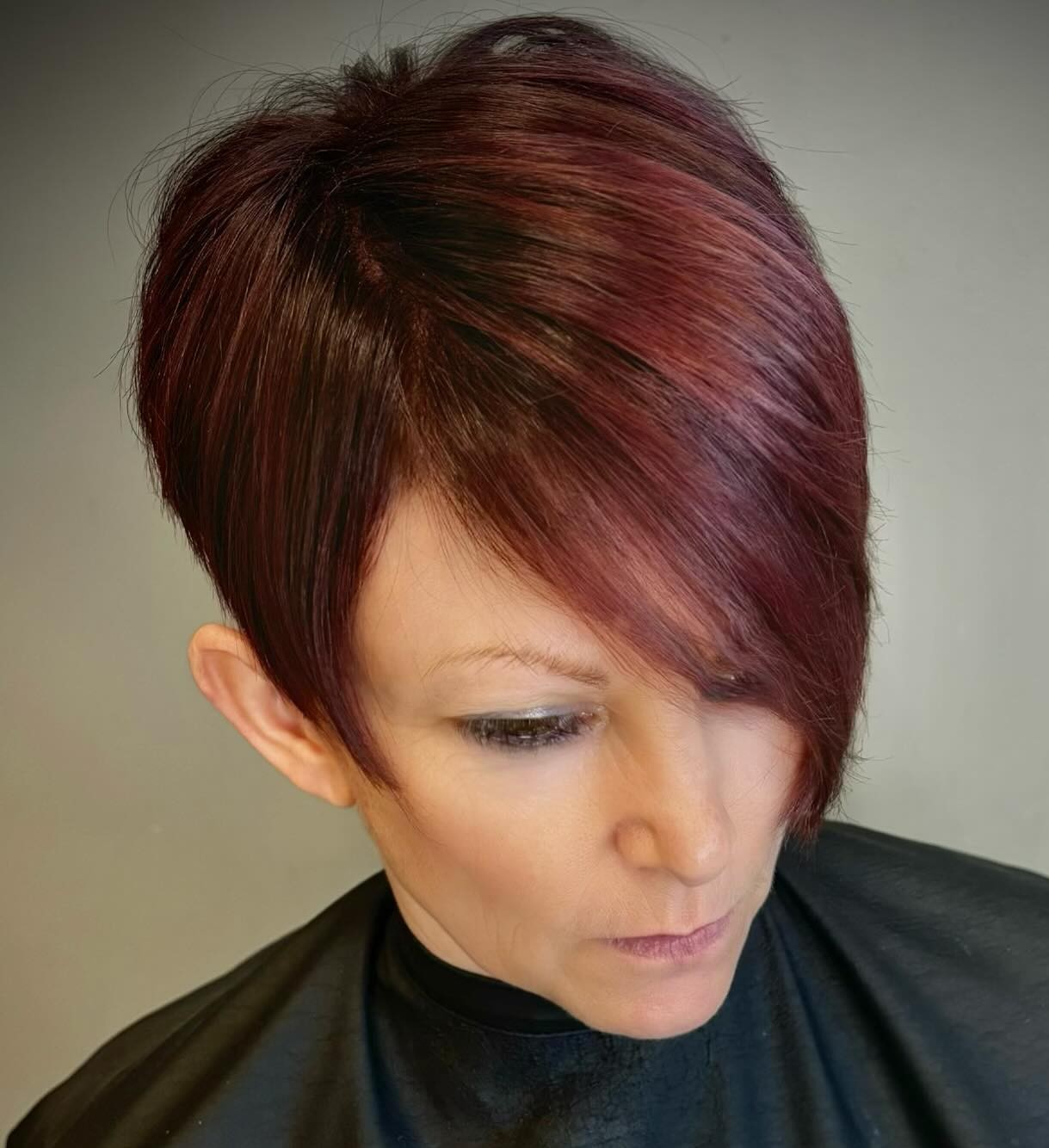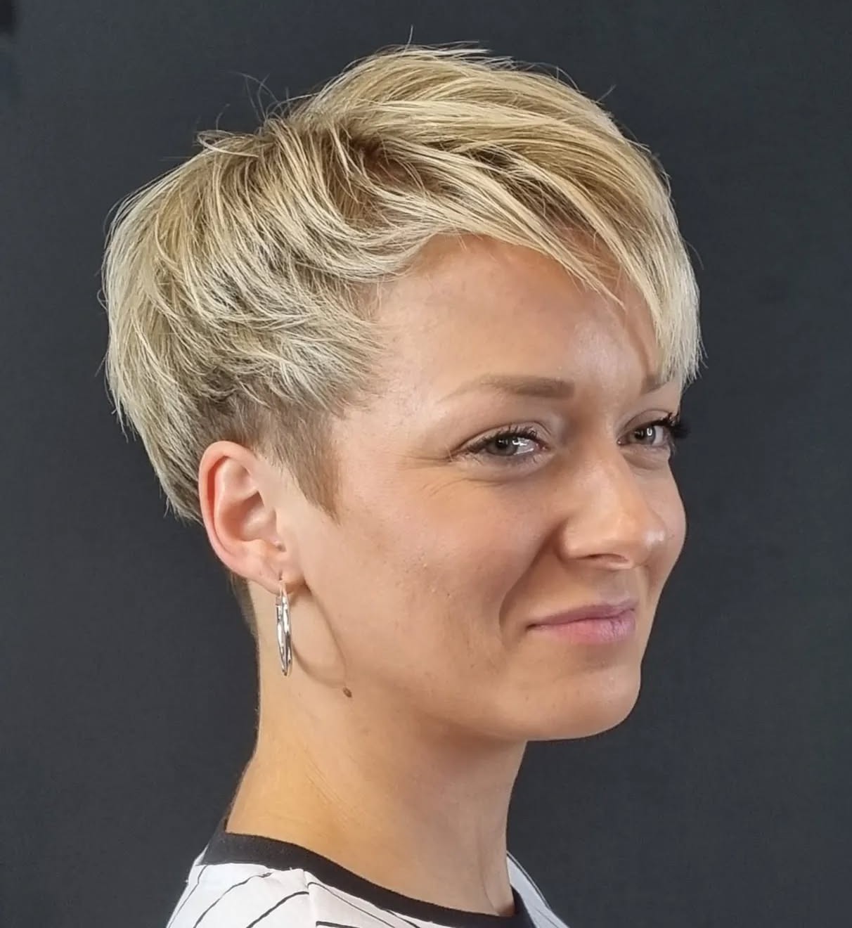 One of the most appealing things about a pixie cut with asymmetry is the side view. With a graduated back, high crown and wispy side fringe, it’s magnificent from every angle.