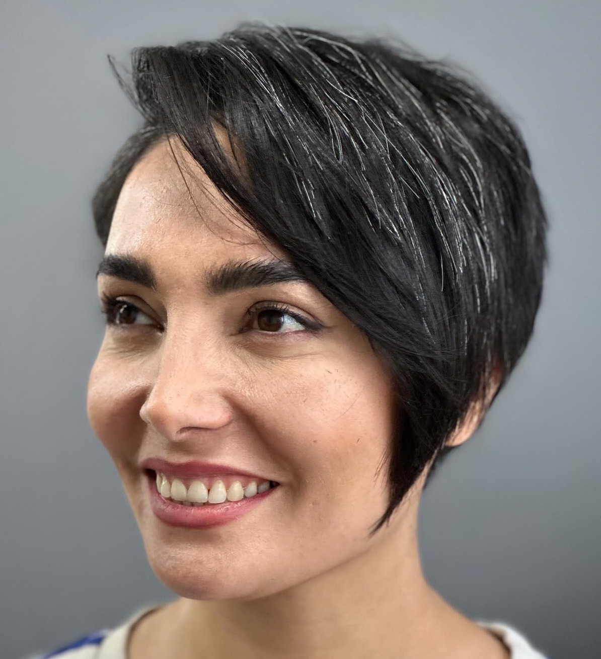 Brunettes look beautiful with short hair, and pixie cuts can flatter a variety of facial types. If you’re looking for a square-face-flattering style, this cut is ideal.