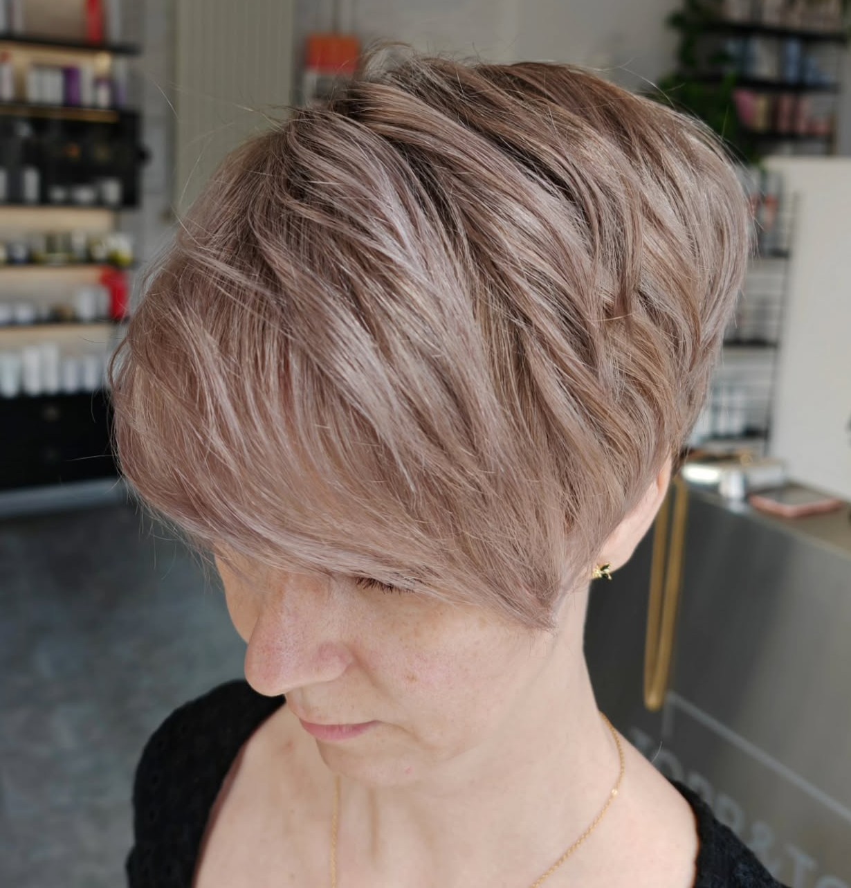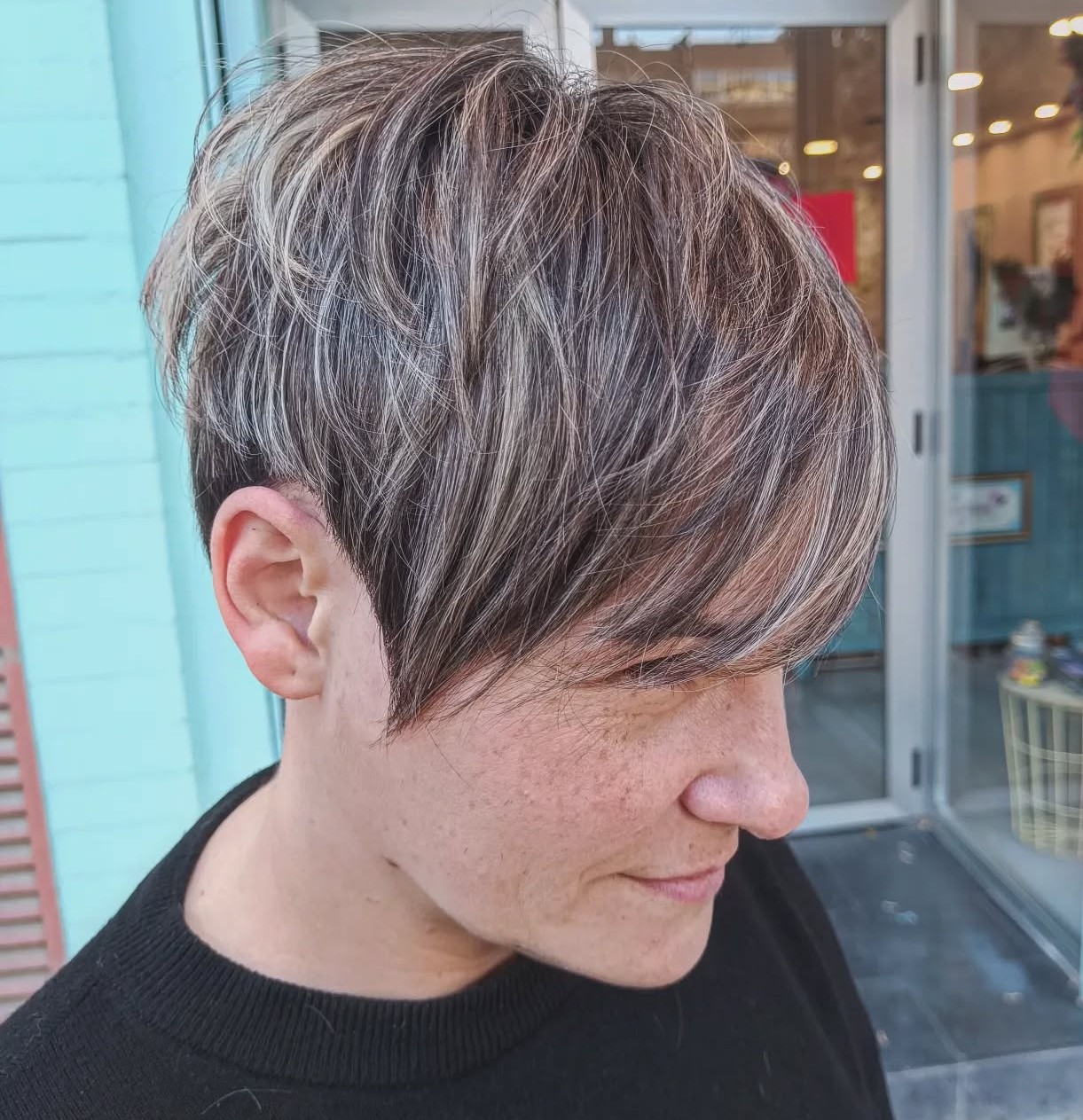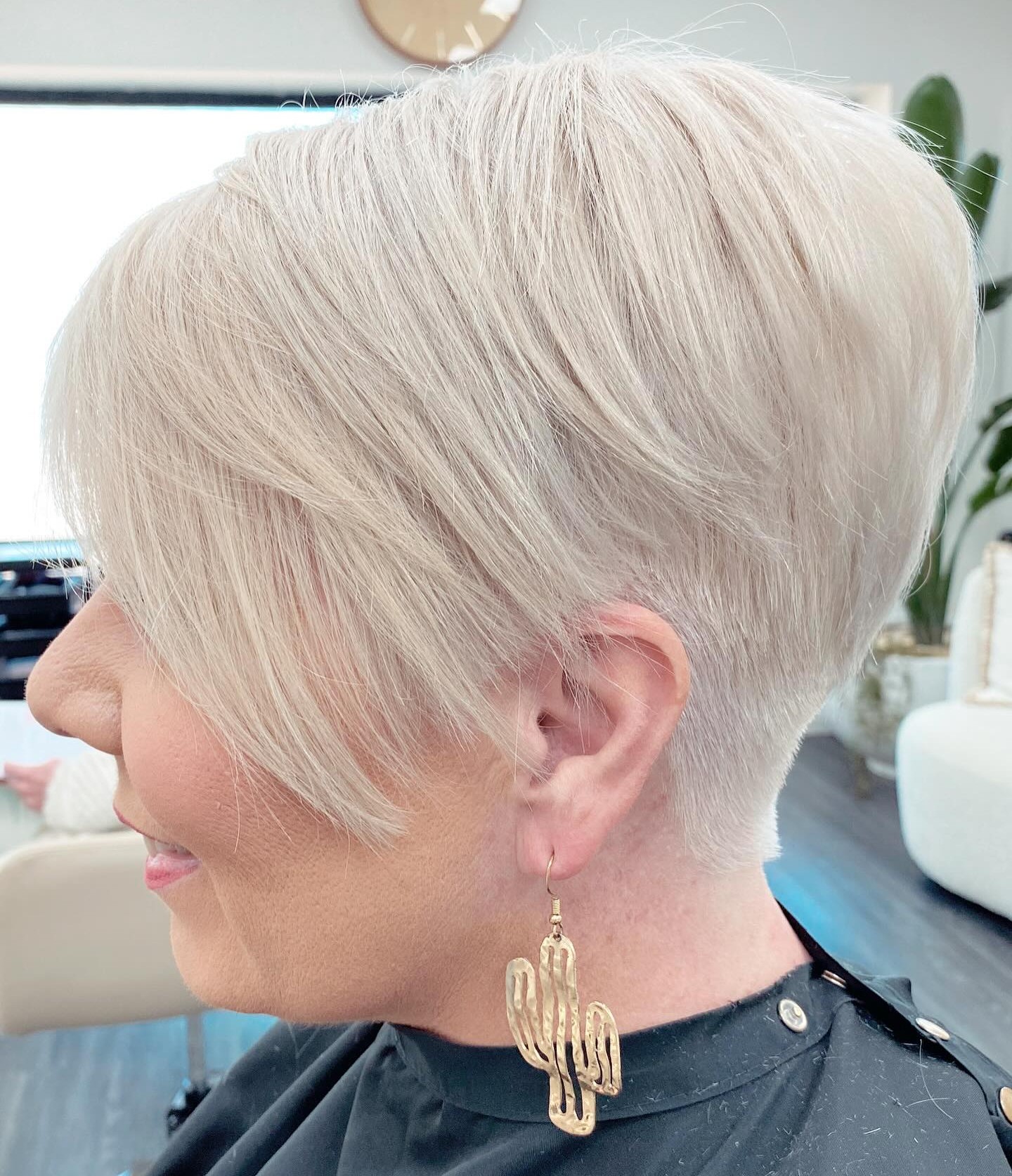 One of the most appealing things about a pixie cut with asymmetry is the side view. With a graduated back, high crown and wispy side fringe, it’s magnificent from every angle.