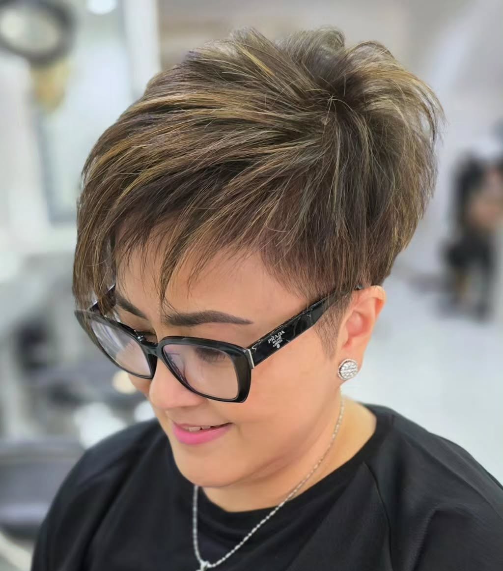 No matter your age or hair type, a deep side parting is the perfect complement to a short asymmetrical pixie. Embrace an extreme part to create full, feminine bangs that can be swept to the side you prefer.