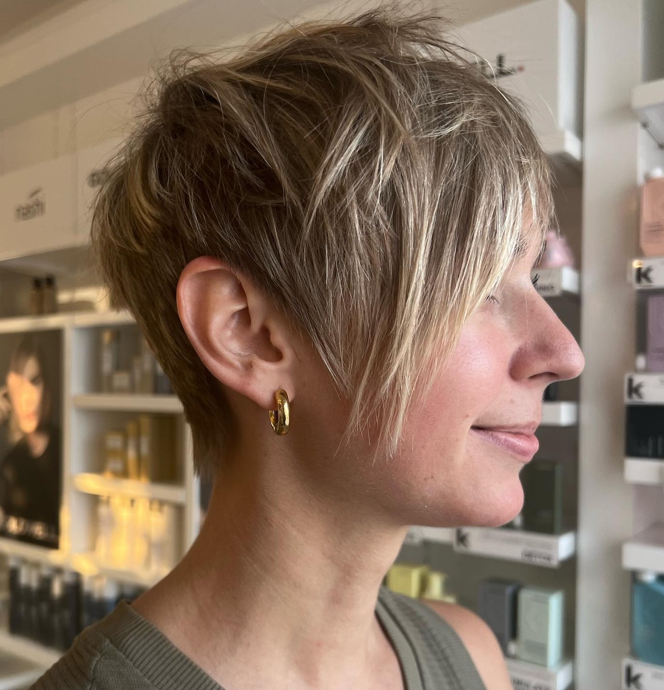 One of the most appealing things about a pixie cut with asymmetry is the side view. With a graduated back, high crown and wispy side fringe, it’s magnificent from every angle.