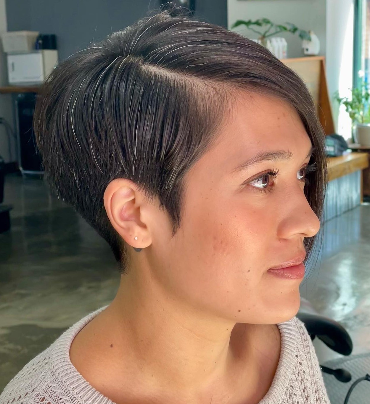 Creatively shaving the sides of your head provides lift and uniqueness to a pixie cut. Once the sides are closely clipped and upgraded with shaven lines, work a few different hues into the remaining strands, further complementing the head design. While not for everyone, this fun modern punk style is finished with some all-day hold hair gel and a generous dose of self-confidence.