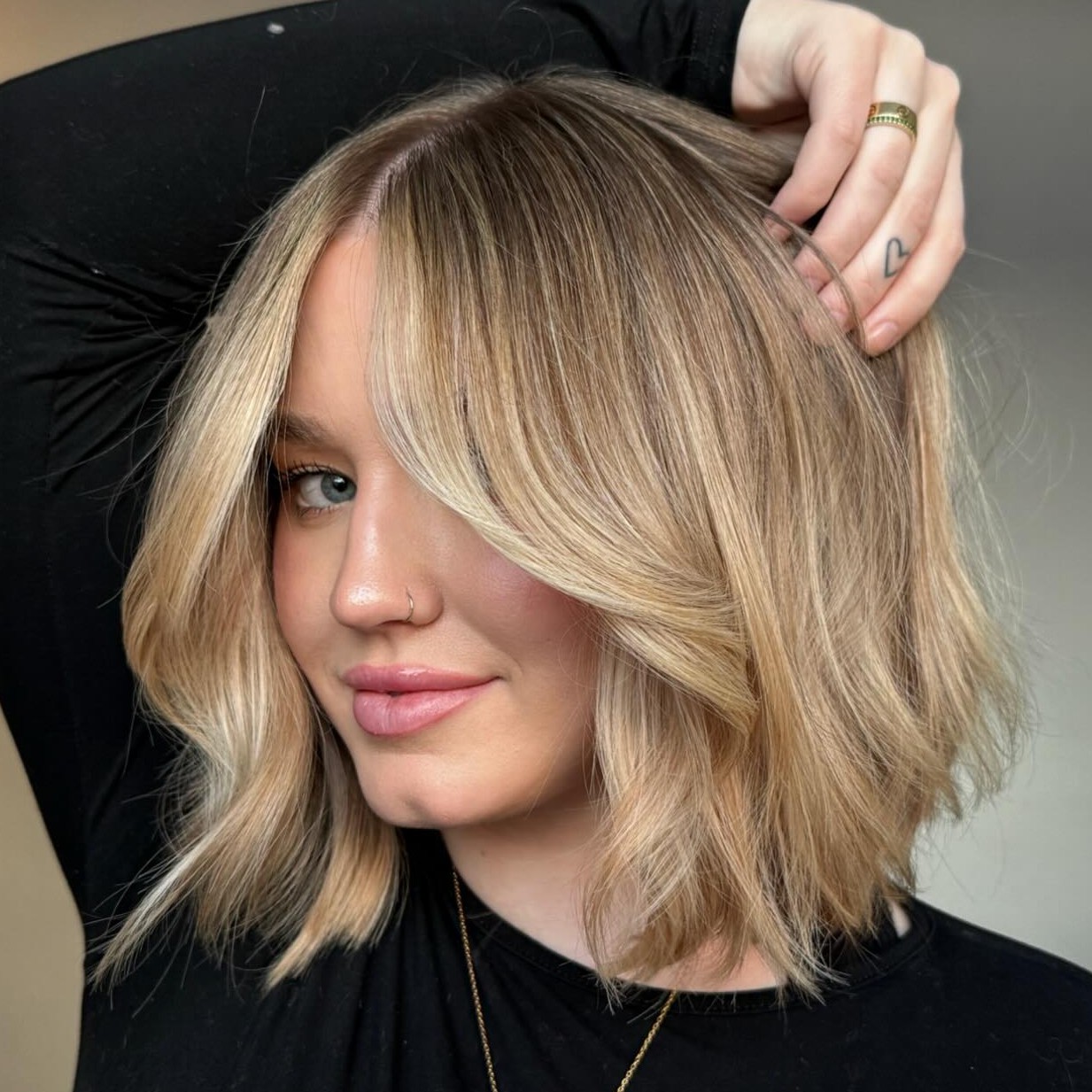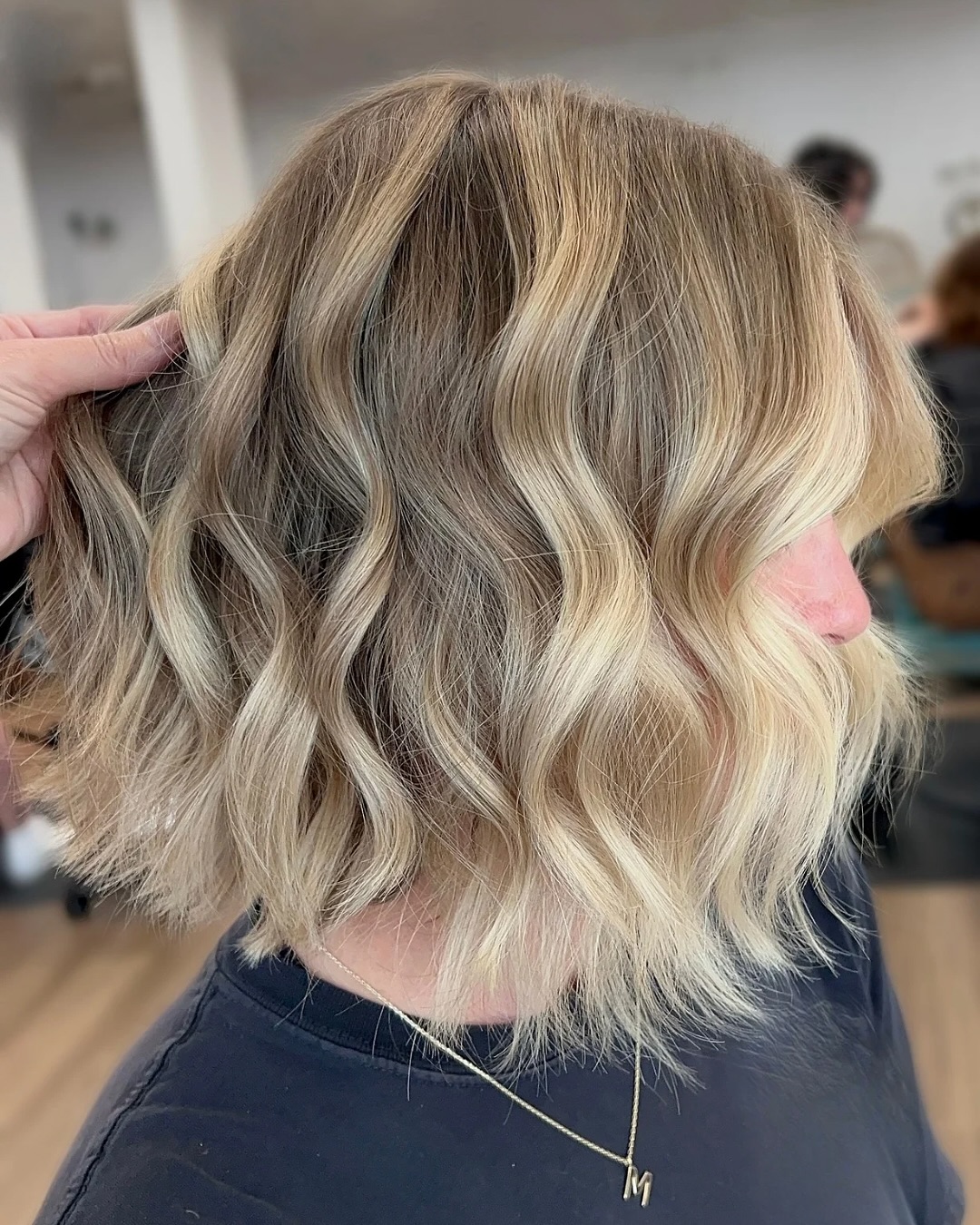 This style with buttery blonde face-framing balayage gives off sophisticated and charming vibes. If you have straight hair, try adding a few bends or curls to show off the color and add some volume.