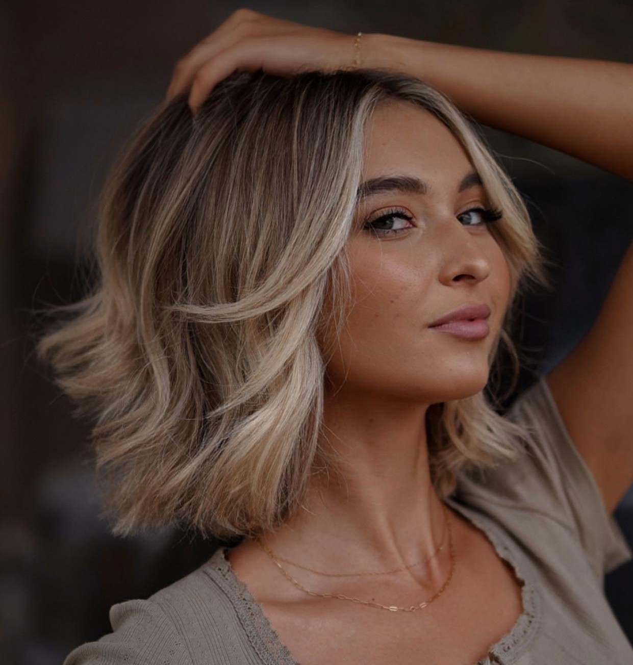 Balayage is a gorgeous, trendy way to reimagine short hair. Nearly any styling approach will look exceptionally chic with pretty blonde highlights like these, but curls truly steal the show! To recreate the glam, use a large-barrel curling iron to curl one or two-inch sections of hair.