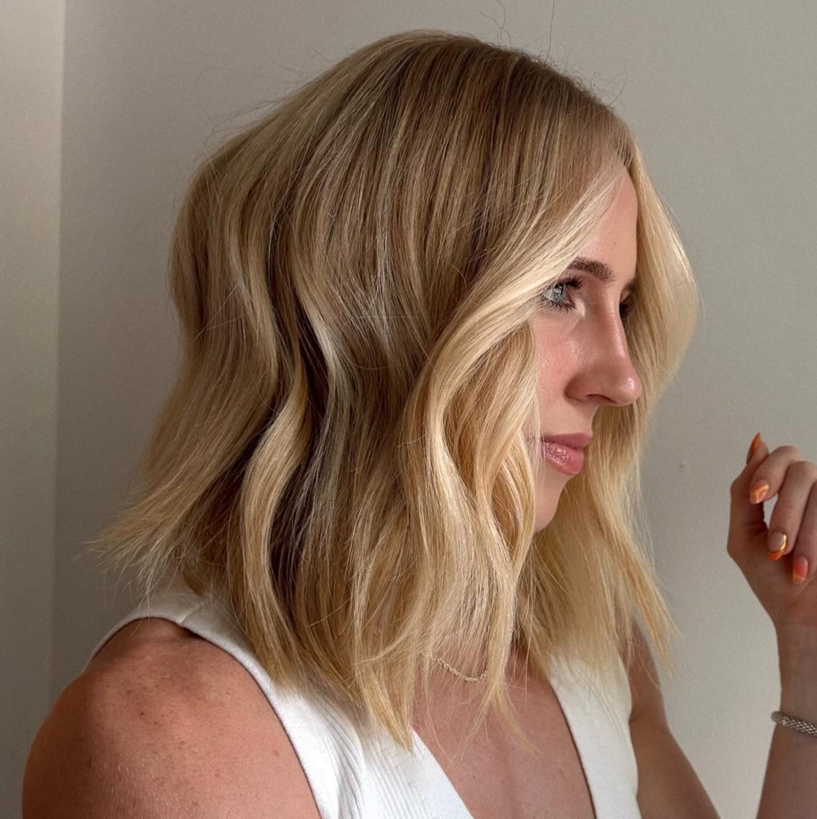 A honey blonde balayage with golden tones will add a healthy and well-rested feel to your look and complement your warm skin tone beautifully.