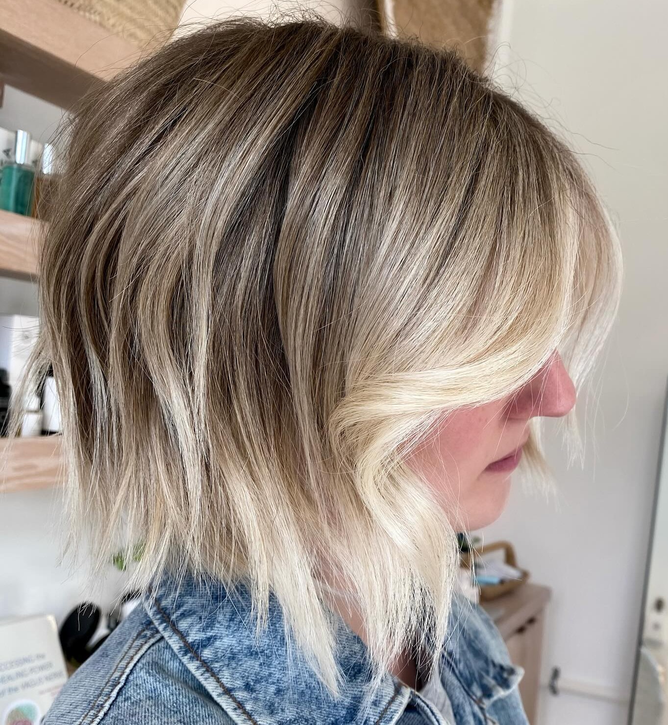 This color solution is a popular choice for women with dishwater blonde hair color. It gives just the right amount of brightness and refreshment for short hair with layers like in the hairstyle.