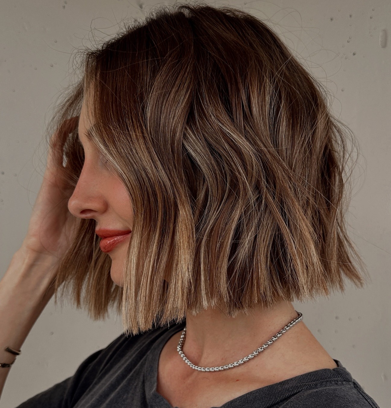 For a natural glam, ask your stylist for full, blended blonde highlights on brown hair. Keeping the hair darker on the roots and the underlayers provides a backdrop for the highlights to really pop. If your hair is naturally wavy, you can let it air dry and simply use a texturizing spray or cream to create definition.