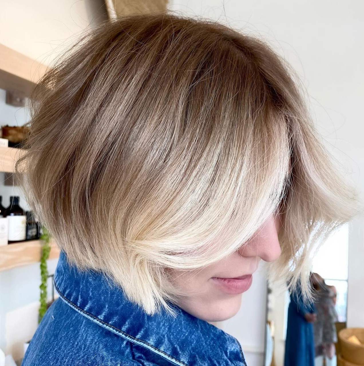 The cool ashy tones harmonize well with this layered bob with peek-a-boo bangs, giving it a fun yet classy vibe.