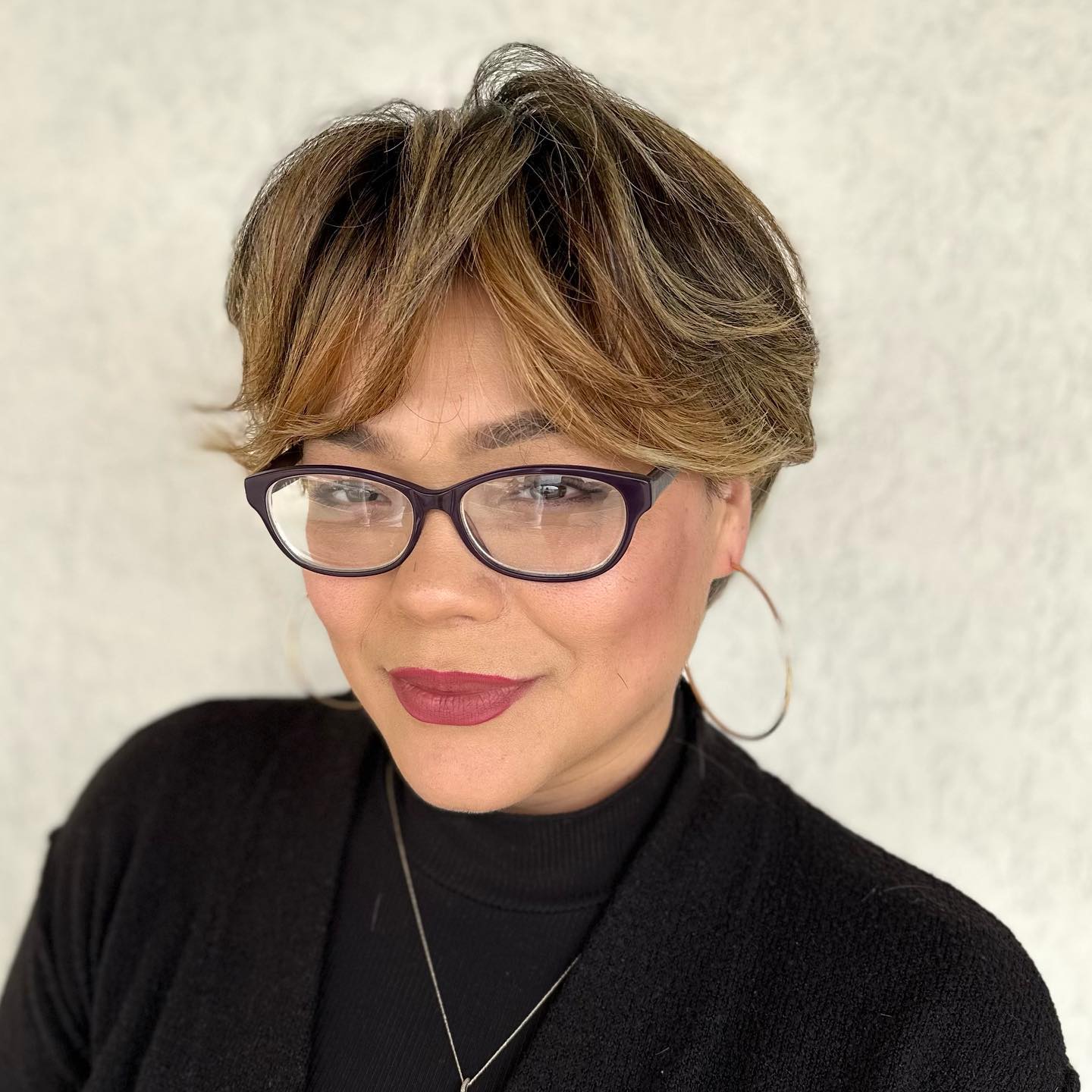 This color solution is a popular choice for women with dishwater blonde hair color. It gives just the right amount of brightness and refreshment for short hair with layers like in the hairstyle.