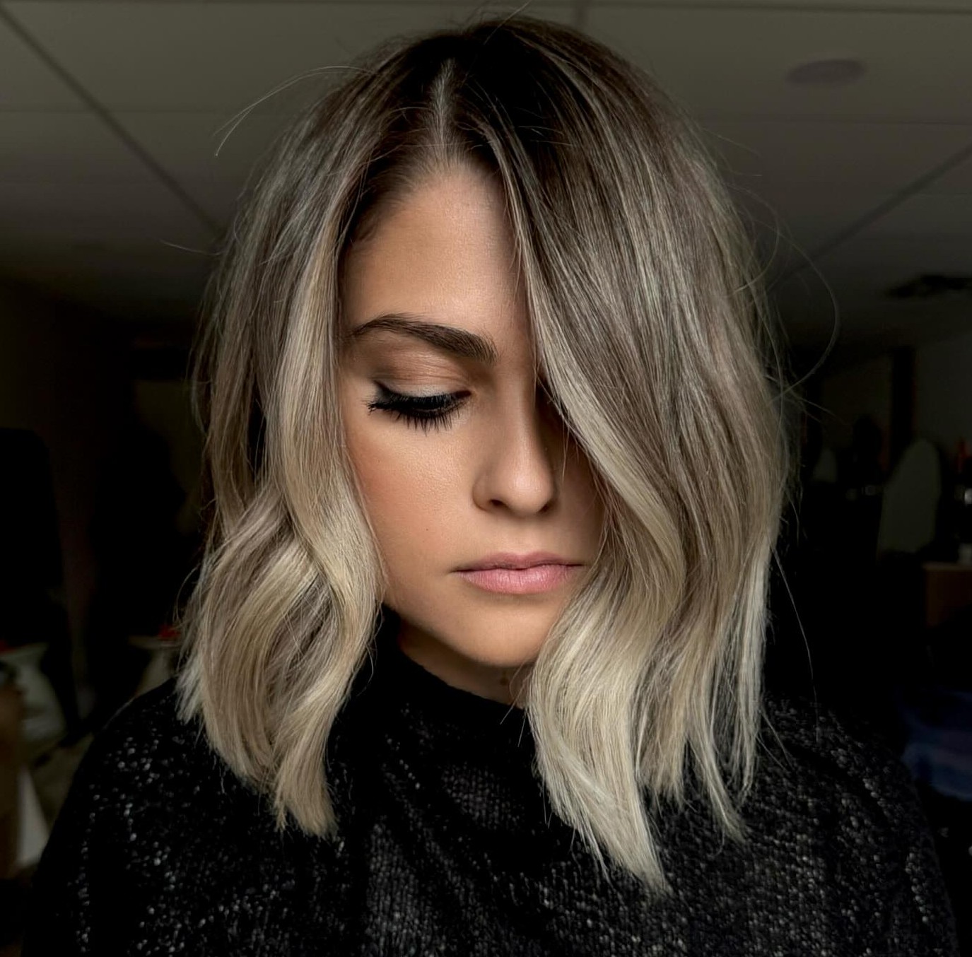 This gorgeous style brings so much warmth and brightness to the face. Thanks to the extra-long face-framing pieces, beachy waves, and super dark roots, this look is edgy and modern. A texturizing spray will be your best friend for achieving the piecey separation.