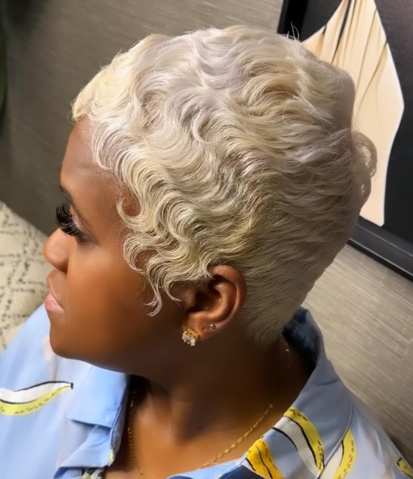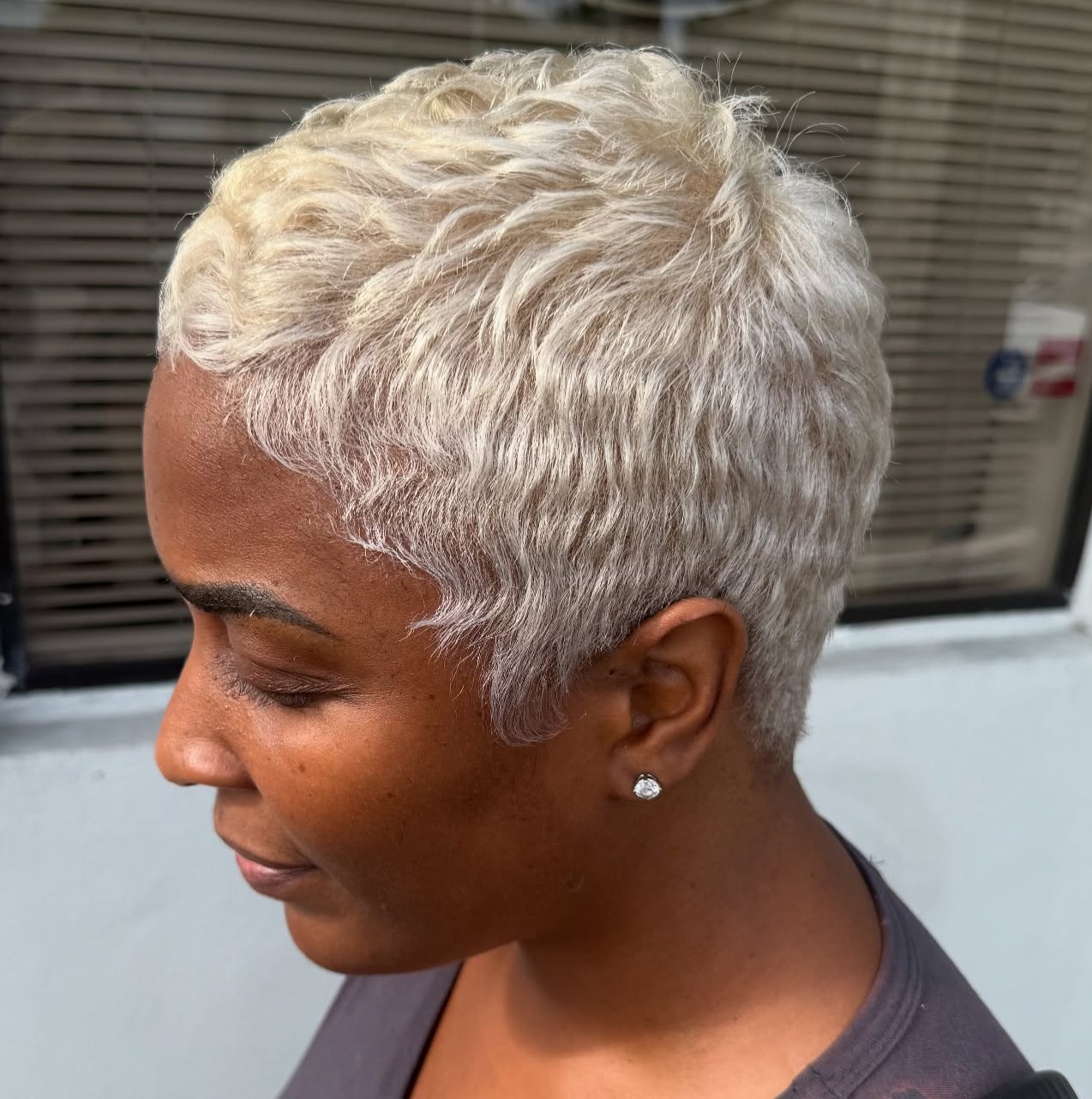 Black women love experiments with blonde hair color. If you want to give it a try too, better pair it with a super short pixie cut like this nearly white stunner. This curly pixie cut with short bangs and a tapered back perfectly frames the face, making you look stylish and sassy.