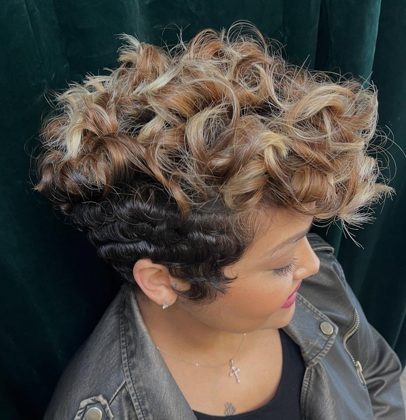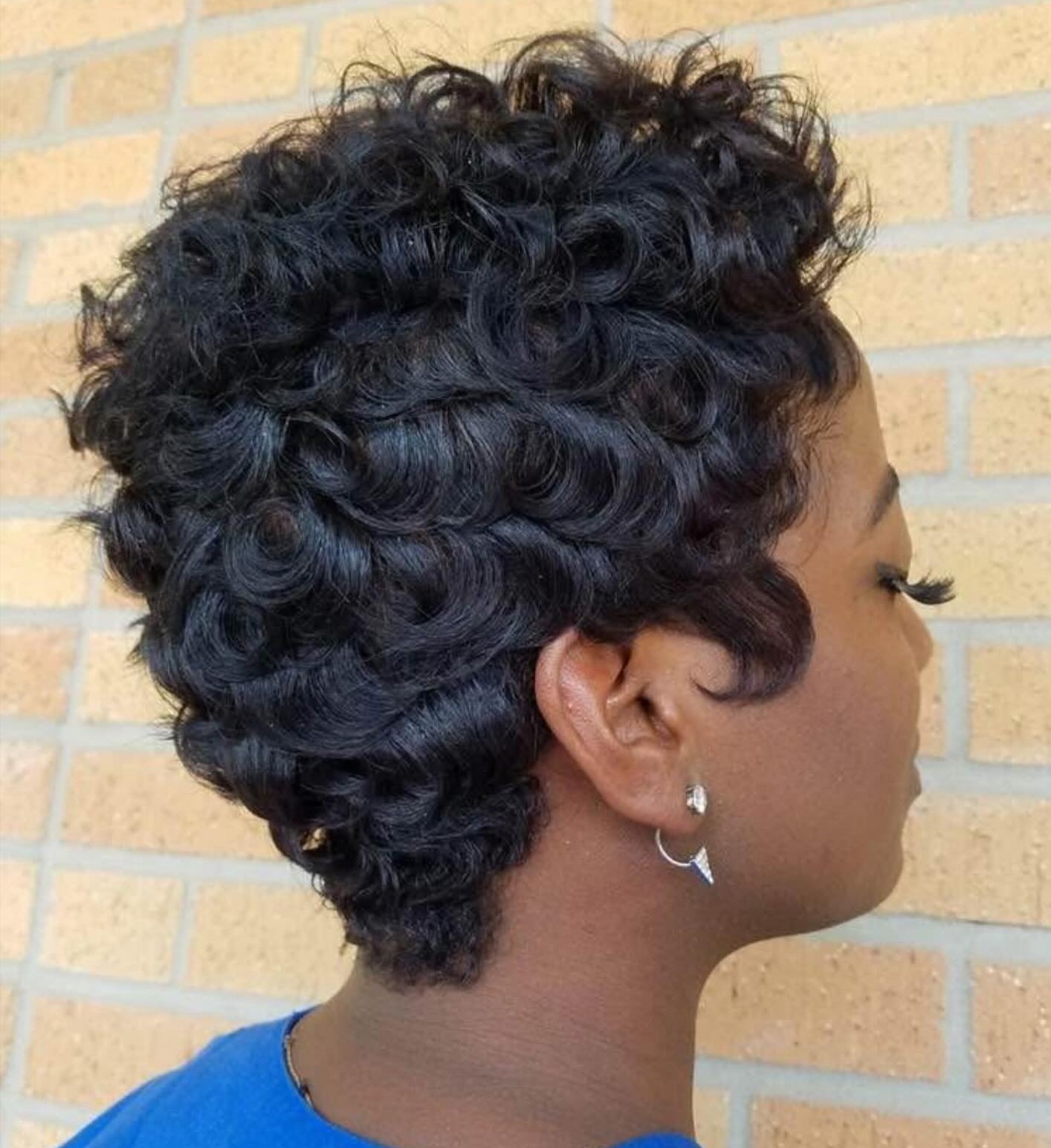 With closely clipped sides and a curly top, this pixie haircut is ideal for a confident black woman. Clean cut to be appropriate for the office, but, clearly, also inviting a party vibe, this hairstyle is given a boost of volume and beautiful, accurate edges.