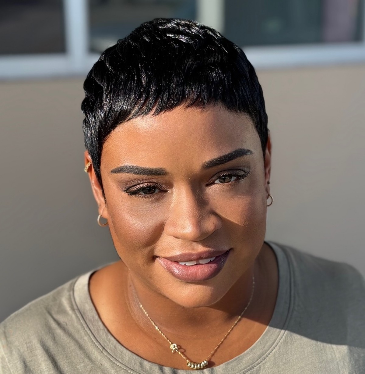 With closely clipped sides and a curly top, this pixie haircut is ideal for a confident black woman. Clean cut to be appropriate for the office, but, clearly, also inviting a party vibe, this hairstyle is given a boost of volume and beautiful, accurate edges.