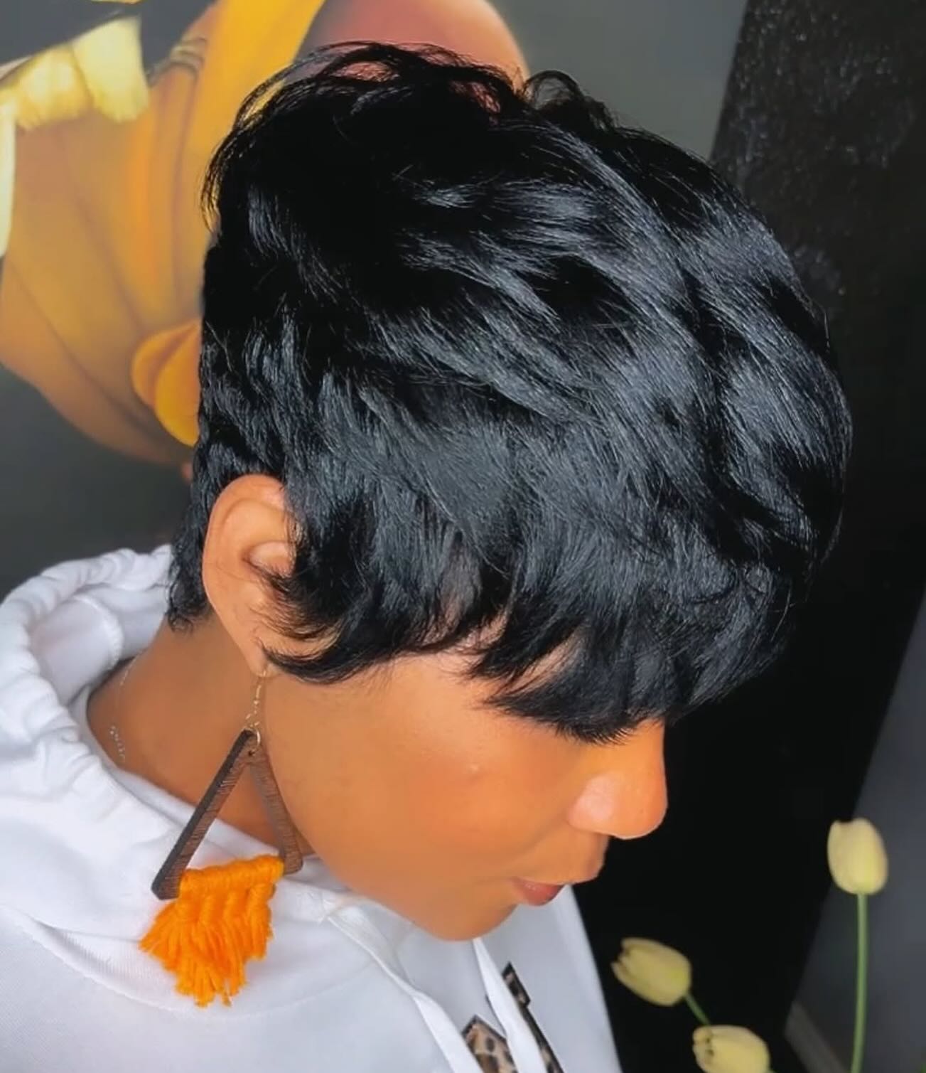 African American pixie cuts don’t have to be boring – play around with your hair’s natural texture for this soft, tousled look with shorter and longer layers. Short front bangs make the look more feminine and softer.