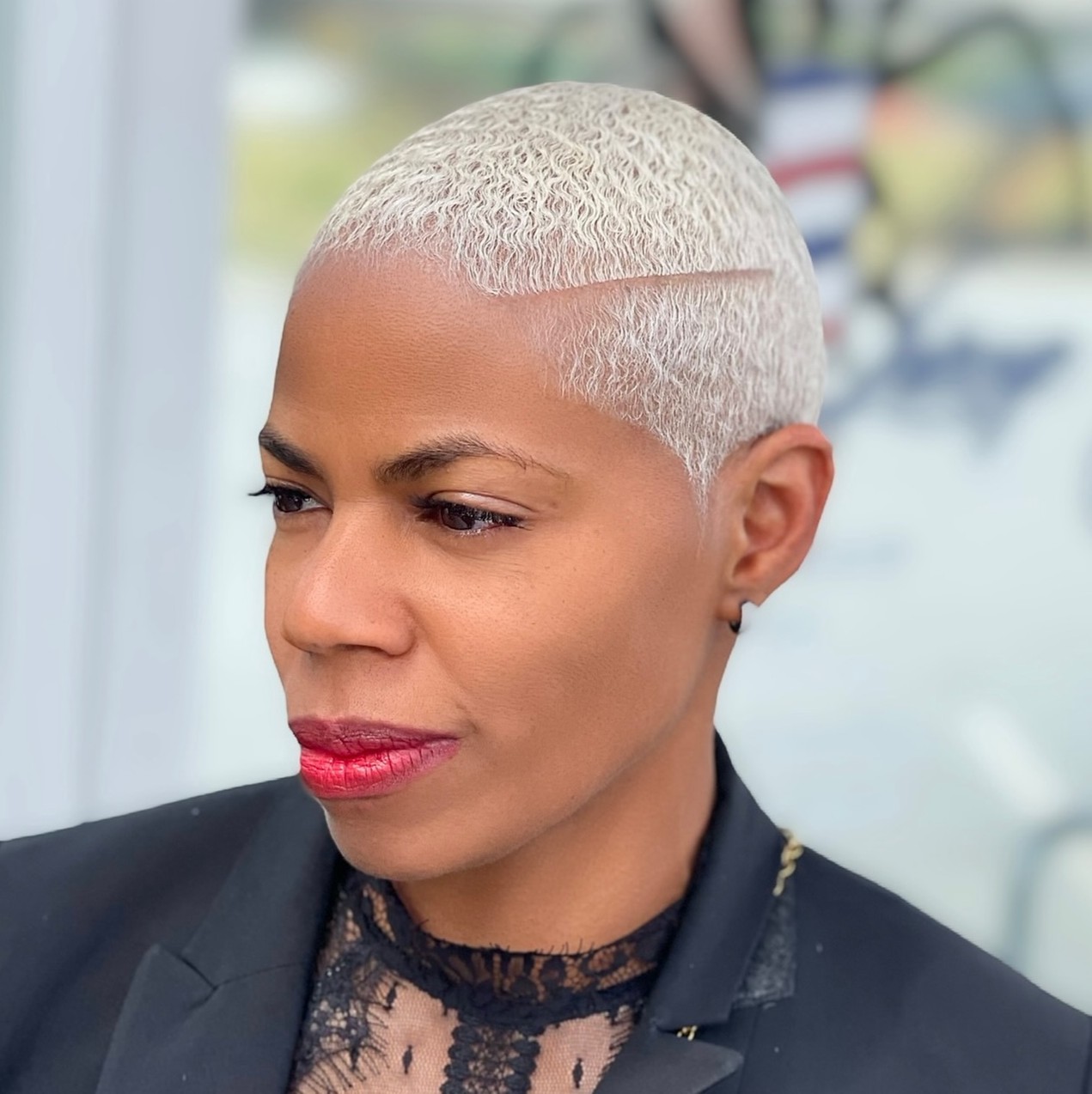 Black women love experimenting with blonde hair color. If you want to give it a try too, better pair it with a super short cut like this nearly white stunner. A curly cut with short bangs and a tapered back perfectly frames the face, making you look stylish.