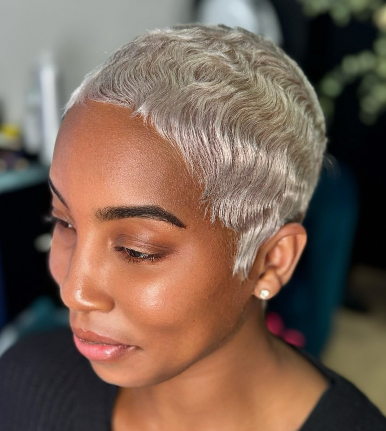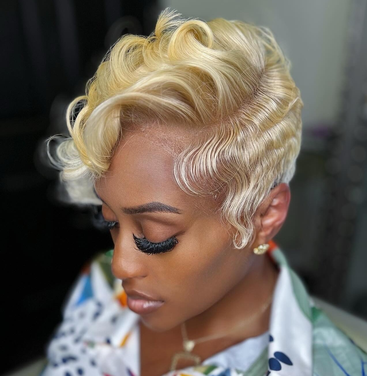 Black women love experiments with blonde hair color. If you want to give it a try too, better pair it with a super short pixie cut like this nearly white stunner. This curly pixie cut with short bangs and a tapered back perfectly frames the face, making you look stylish and sassy.