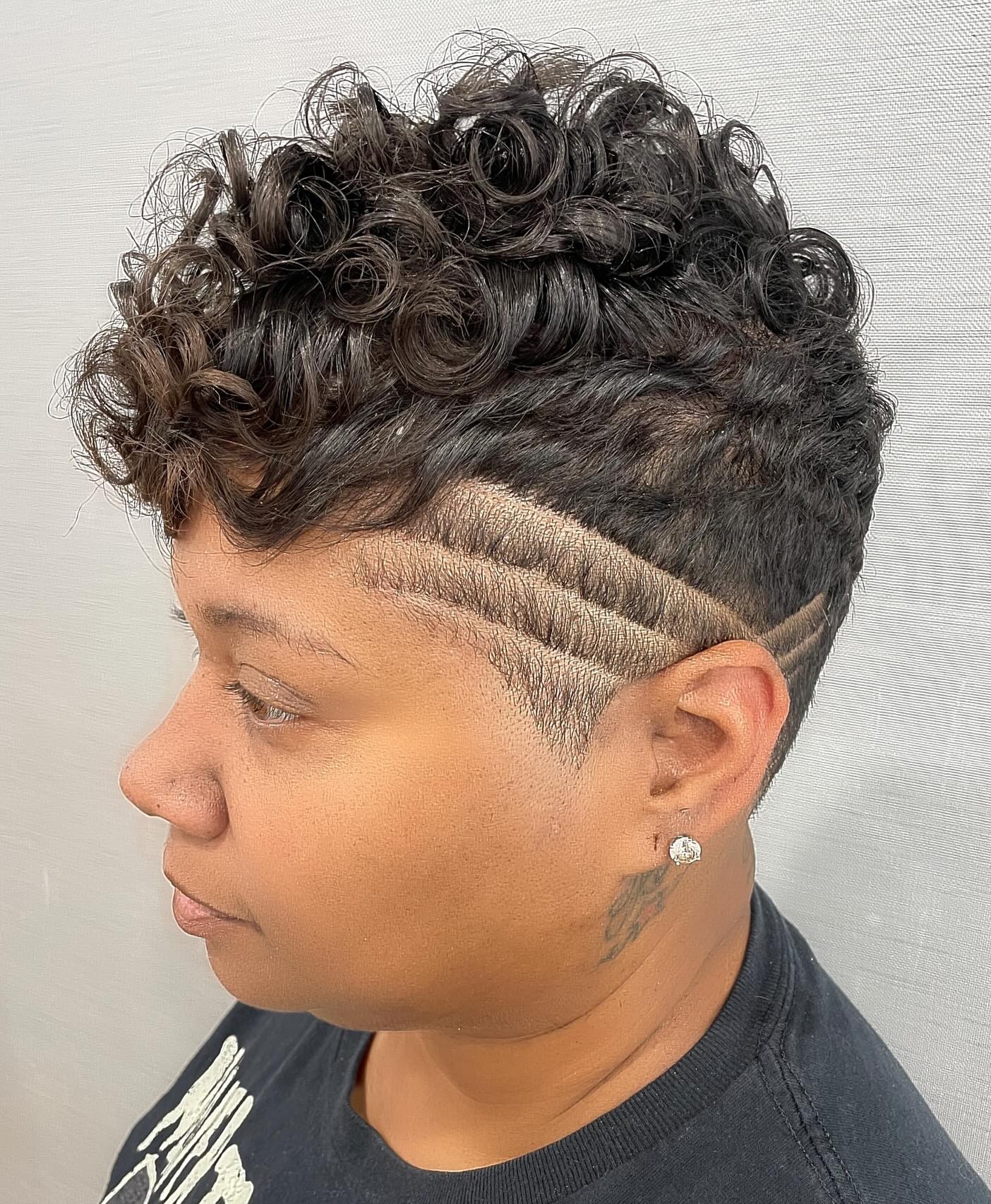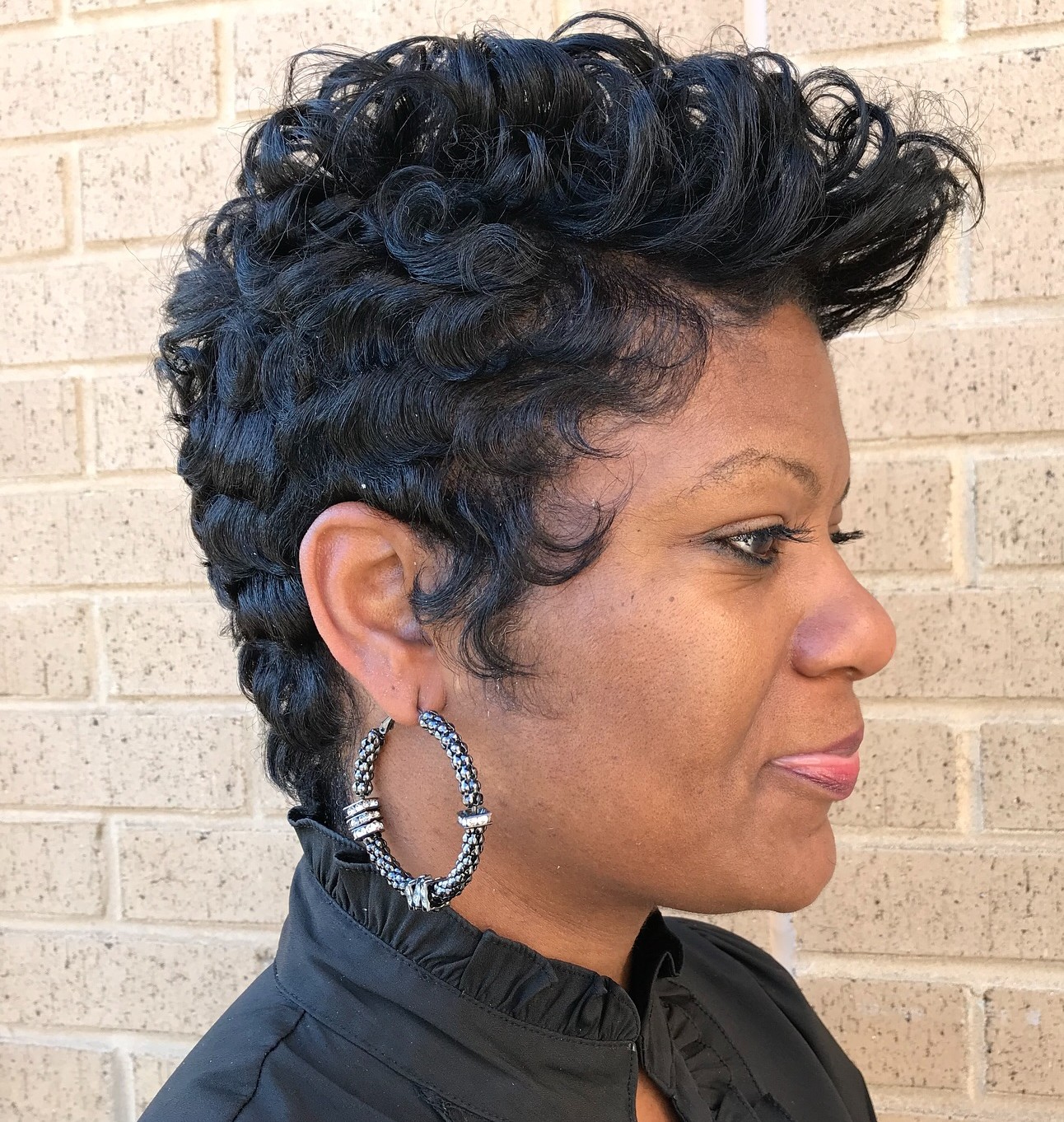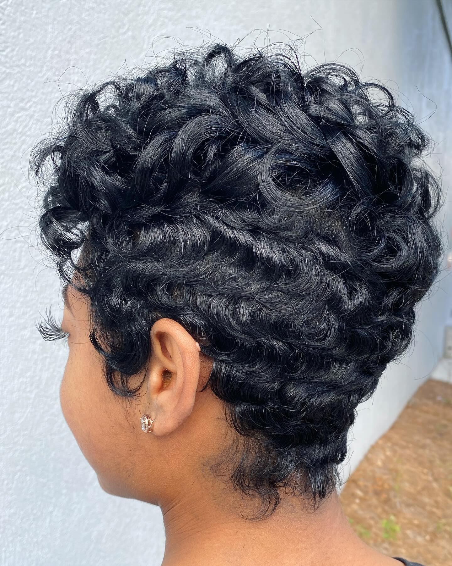 With closely clipped sides and a curly top, this pixie haircut is ideal for a confident black woman. Clean cut to be appropriate for the office, but, clearly, also inviting a party vibe, this hairstyle is given a boost of volume and beautiful, accurate edges.