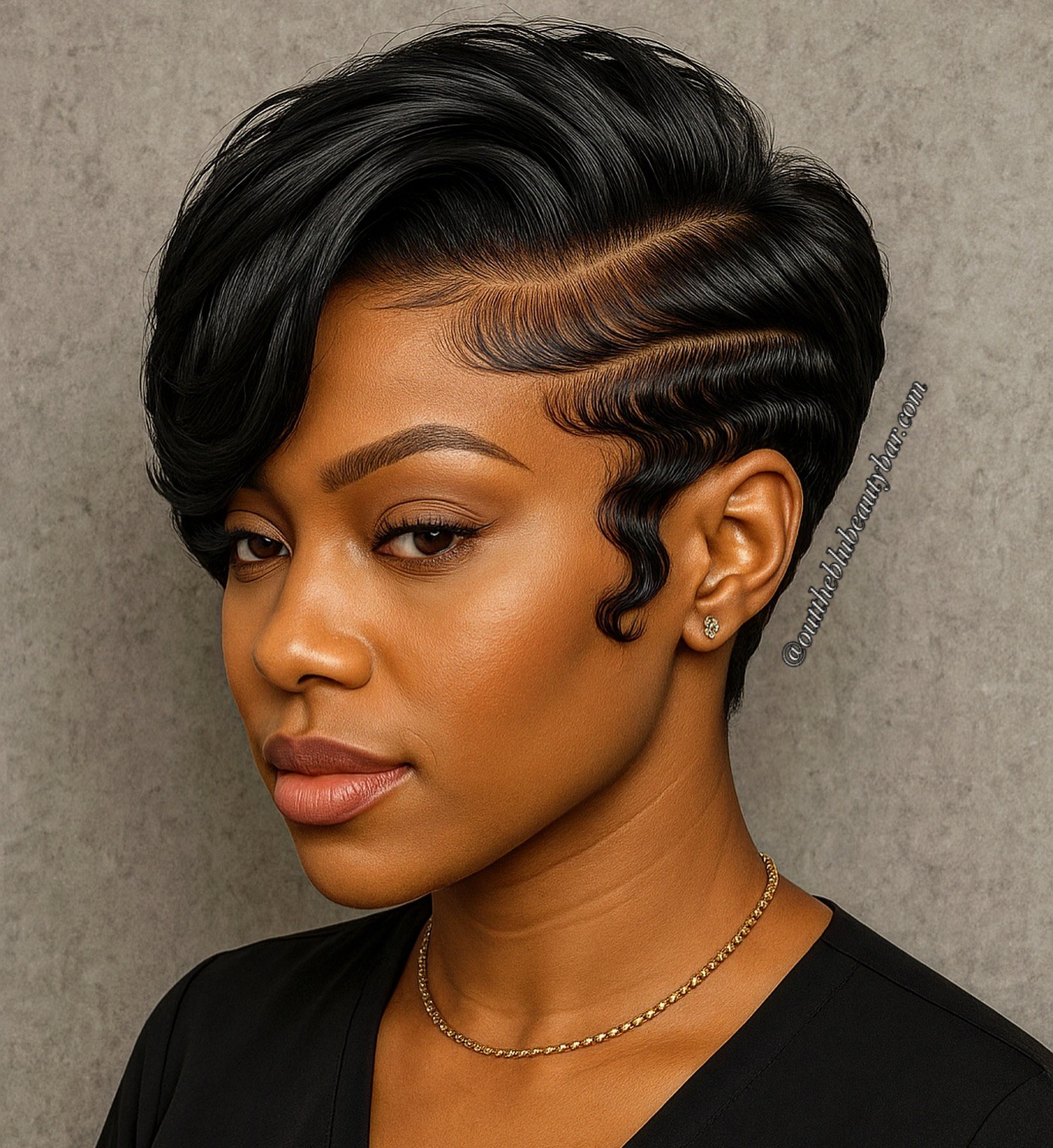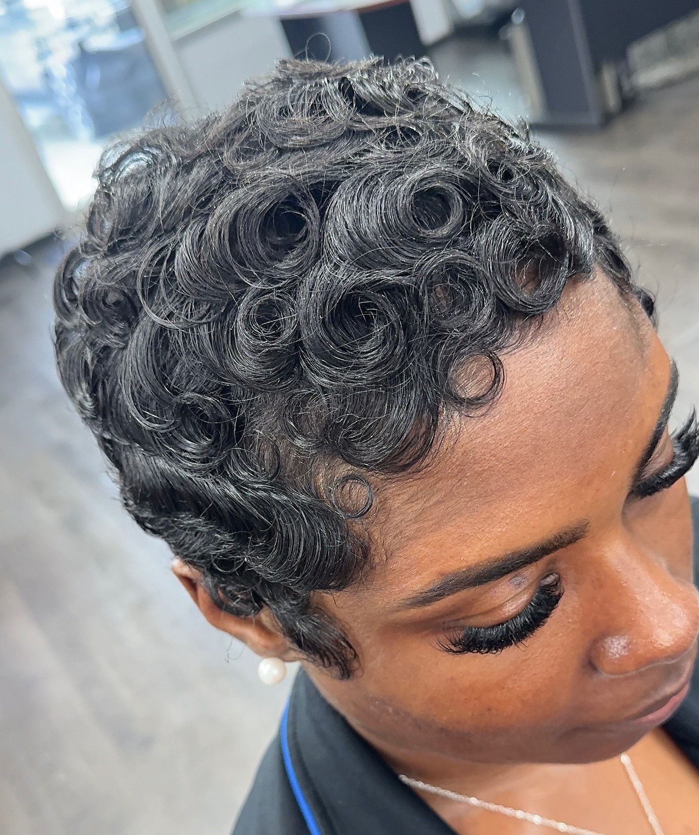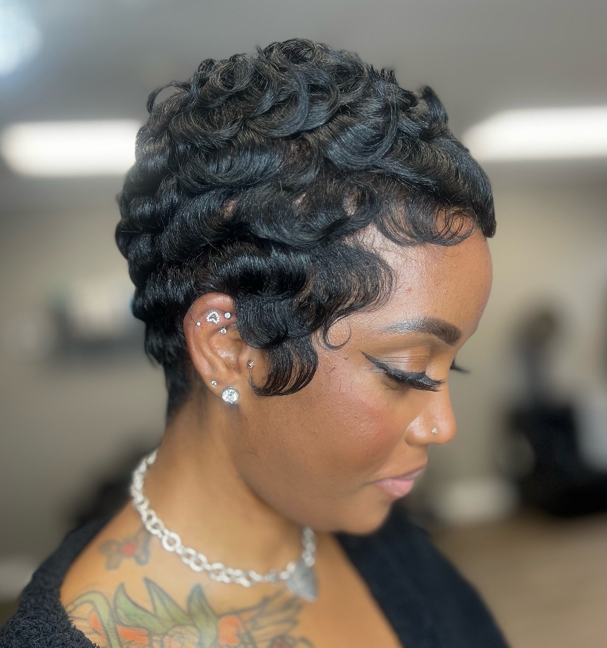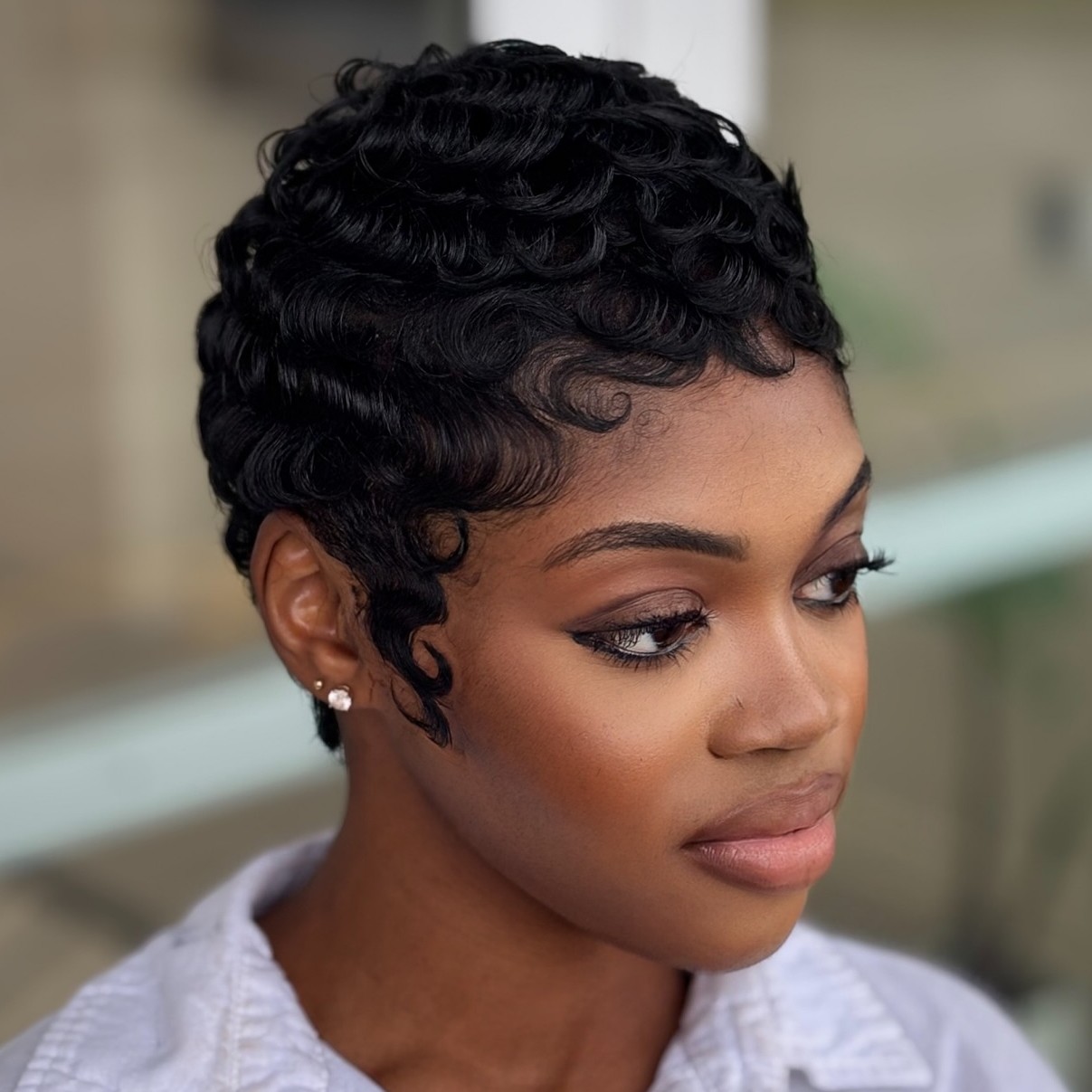 With closely clipped sides and a curly top, this pixie haircut is ideal for a confident black woman. Clean cut to be appropriate for the office, but, clearly, also inviting a party vibe, this hairstyle is given a boost of volume and beautiful, accurate edges.