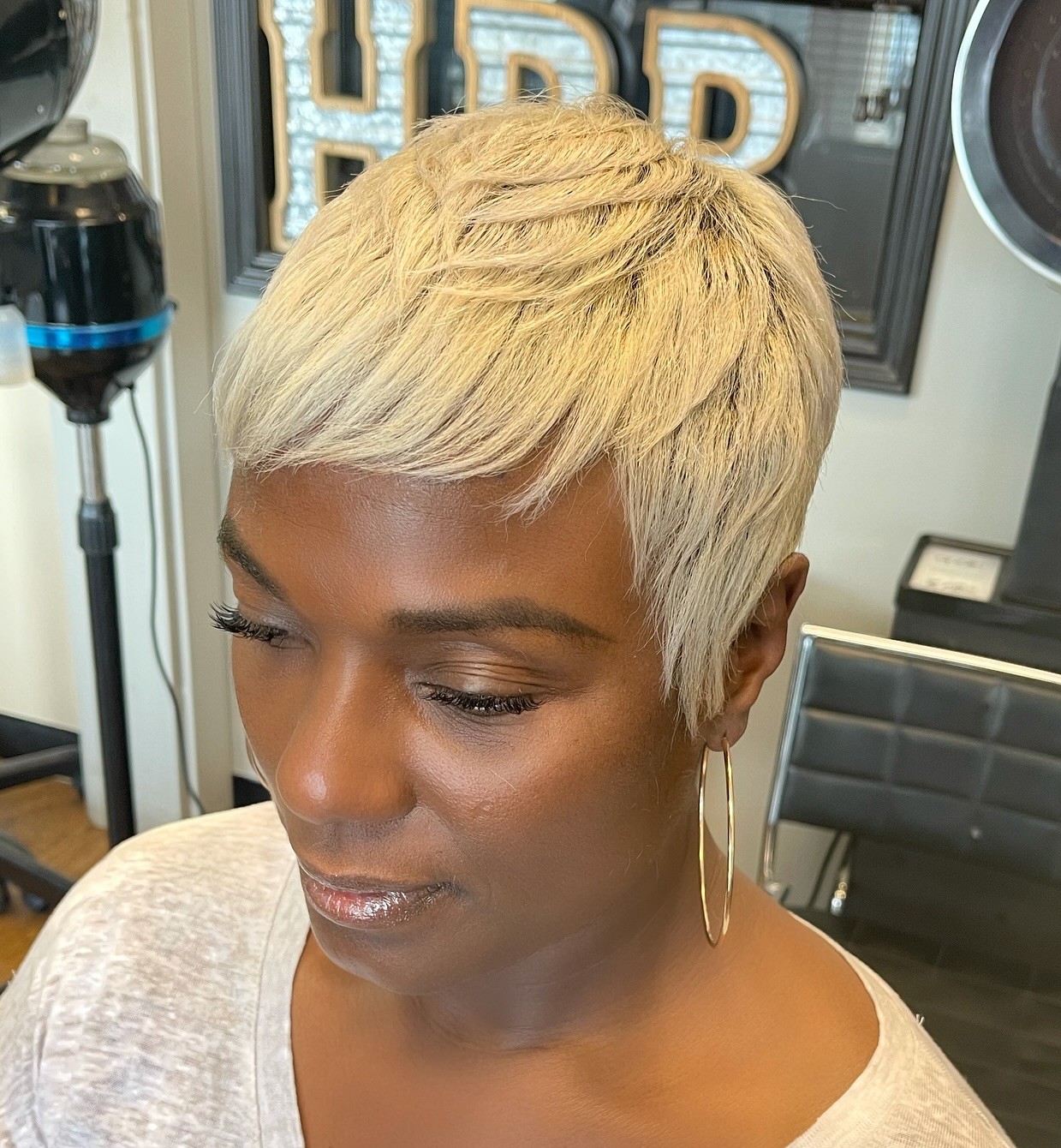 Sometimes blondes do have more fun – especially when it’s a gorgeous, confident African-American with blonde highlights! Black pixie cuts don’t have to commit to one hue – mix it up with blonde, red or vibrant neon colored highlights.