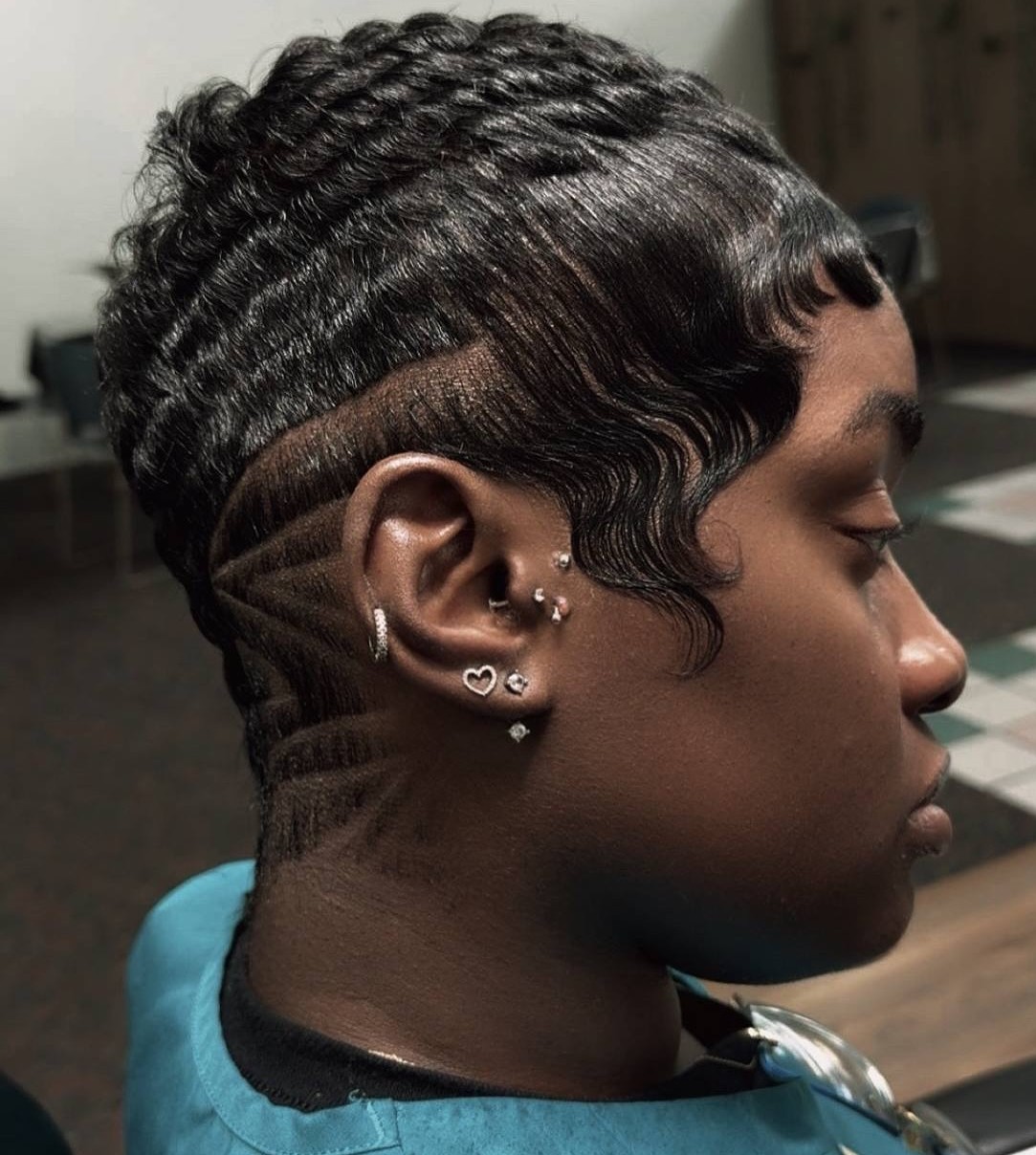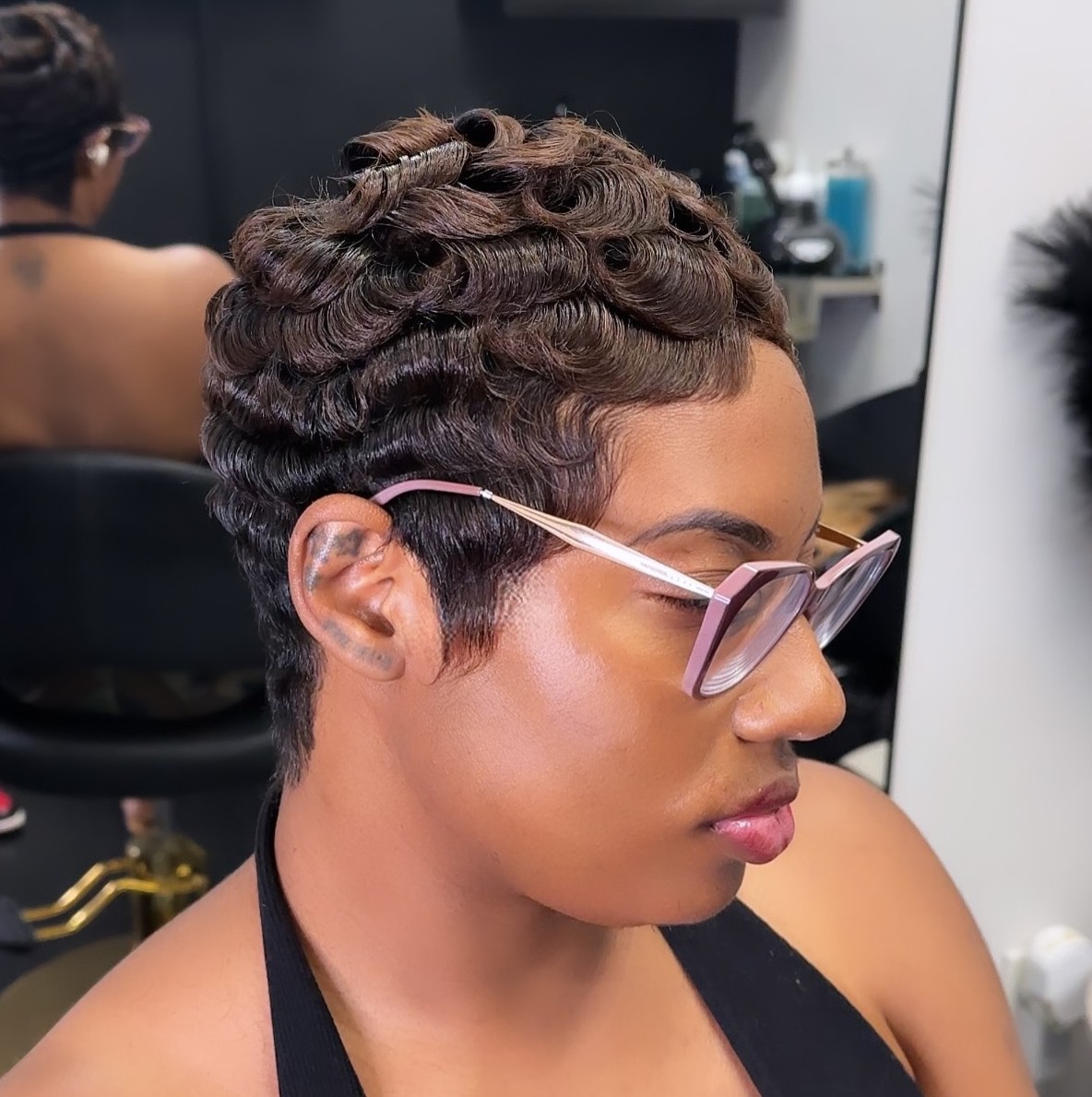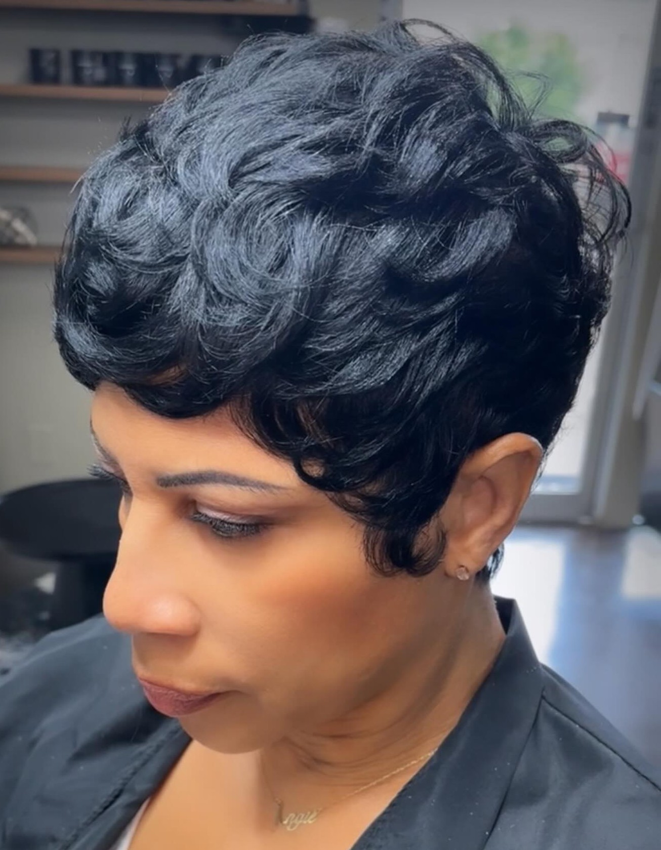With closely clipped sides and a curly top, this pixie haircut is ideal for a confident black woman. Clean cut to be appropriate for the office, but, clearly, also inviting a party vibe, this hairstyle is given a boost of volume and beautiful, accurate edges.