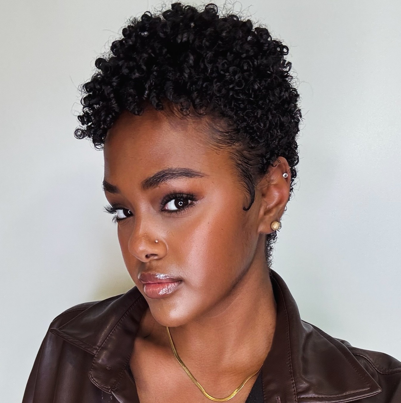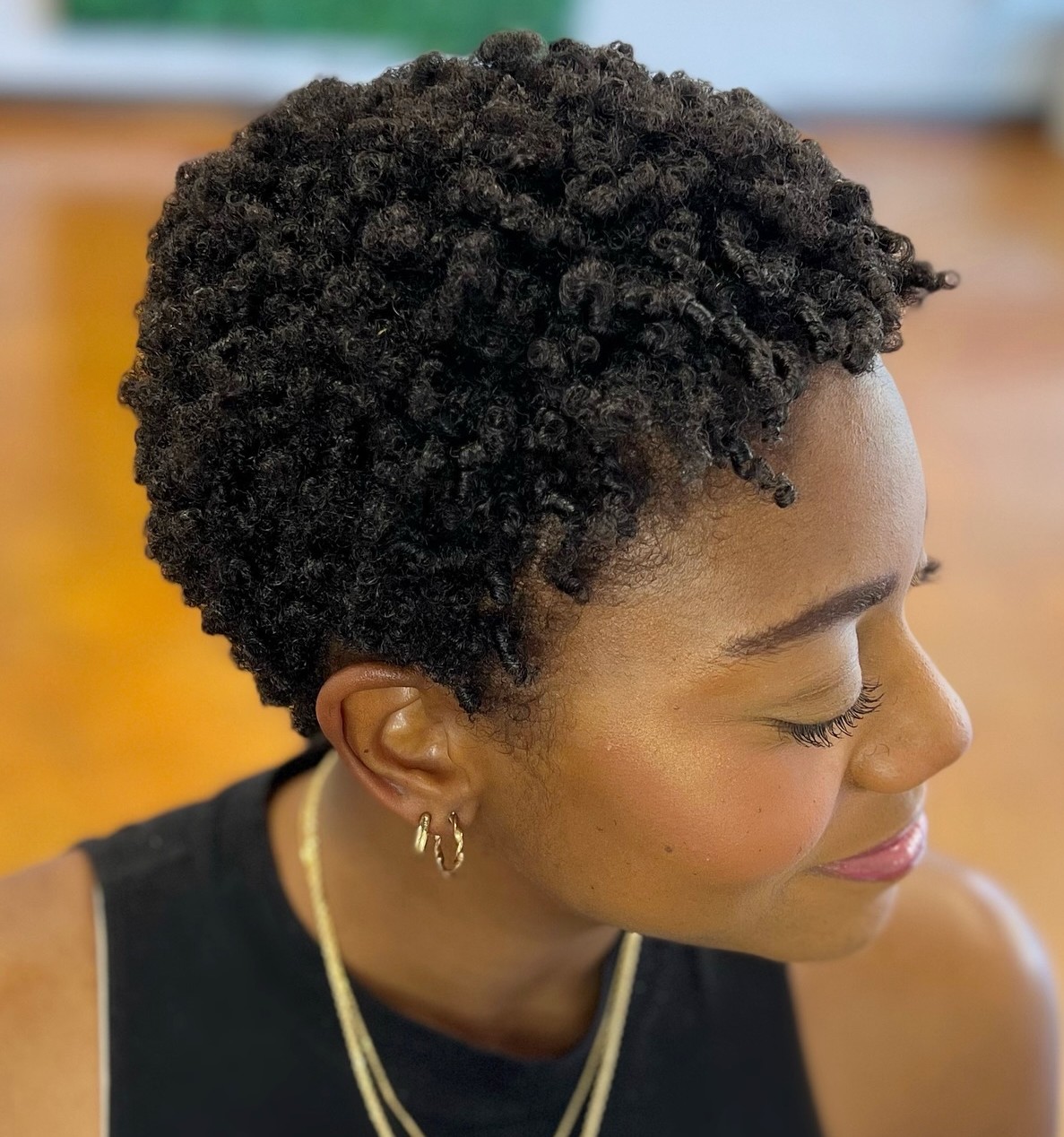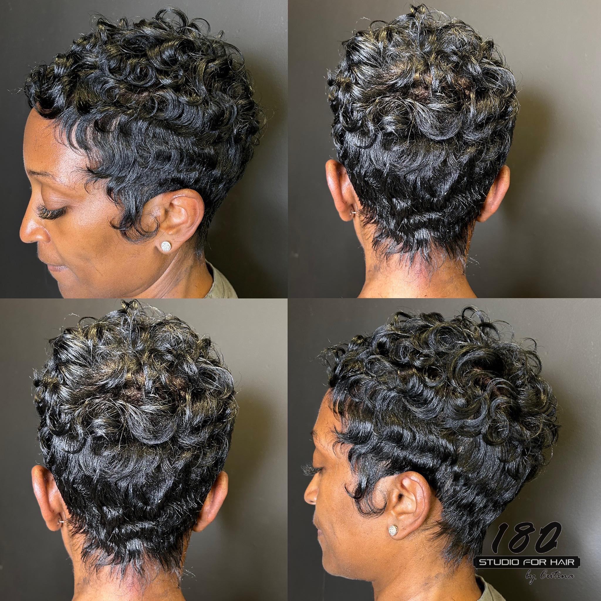 With closely clipped sides and a curly top, this pixie haircut is ideal for a confident black woman. Clean cut to be appropriate for the office, but, clearly, also inviting a party vibe, this hairstyle is given a boost of volume and beautiful, accurate edges.