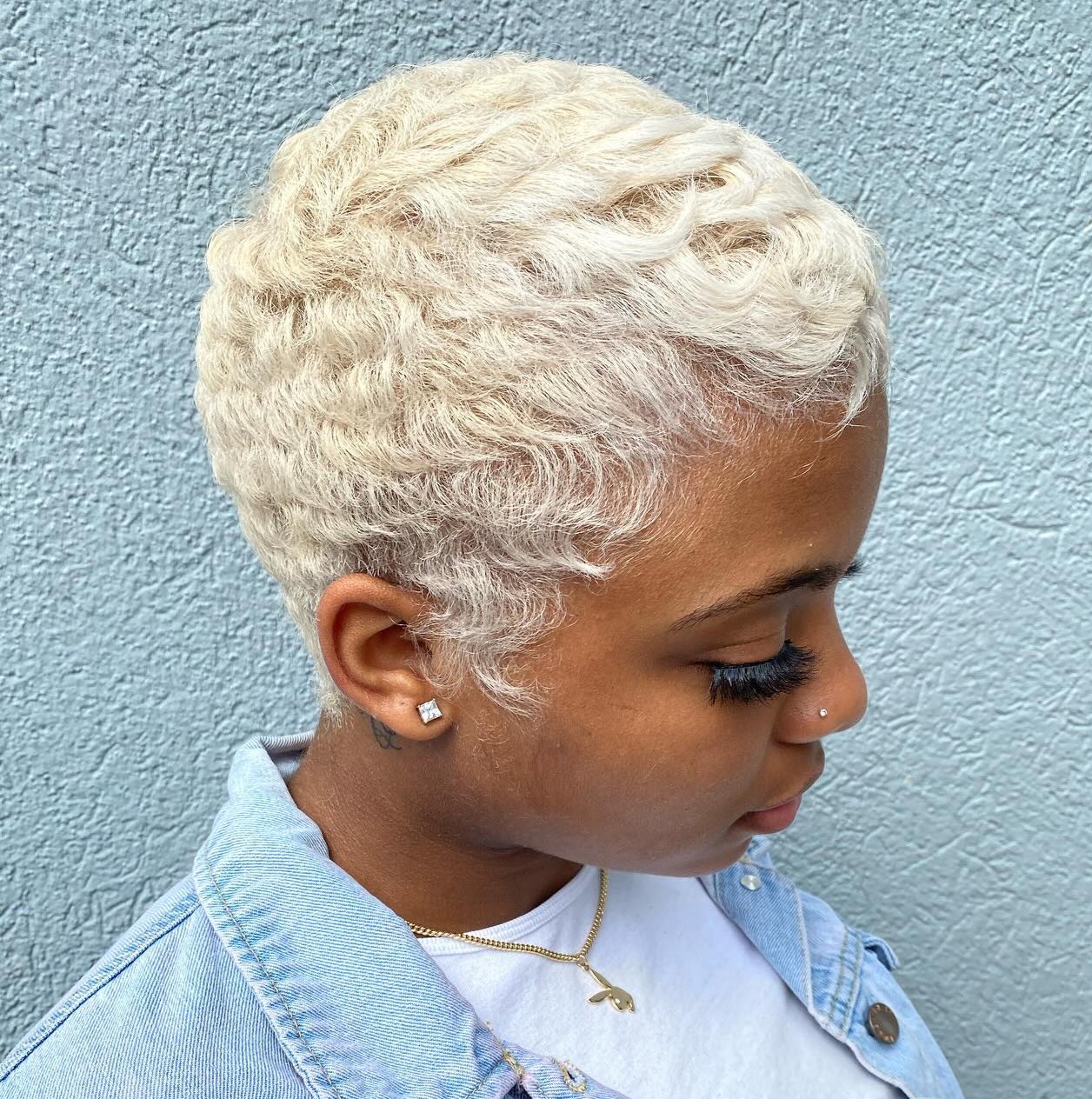 Black women love experiments with blonde hair color. If you want to give it a try too, better pair it with a super short pixie cut like this nearly white stunner. This curly pixie cut with short bangs and a tapered back perfectly frames the face, making you look stylish and sassy.