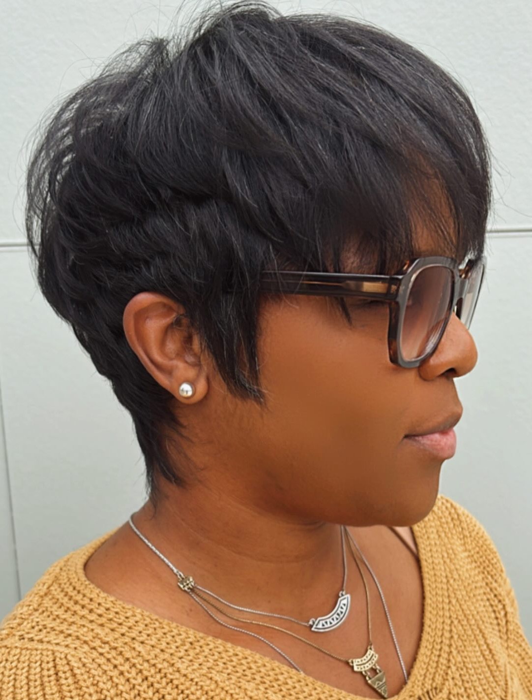 Look how extravagant this black pixie crop looks. Wispy layers on top add extra volume, while vivid fringe creates a trendy bold look. It can also bring out the eyes and help you regrow thinning edges.