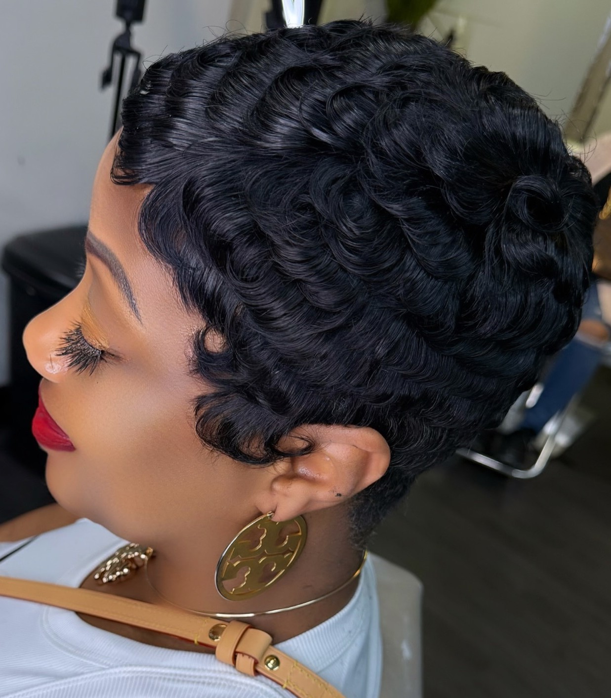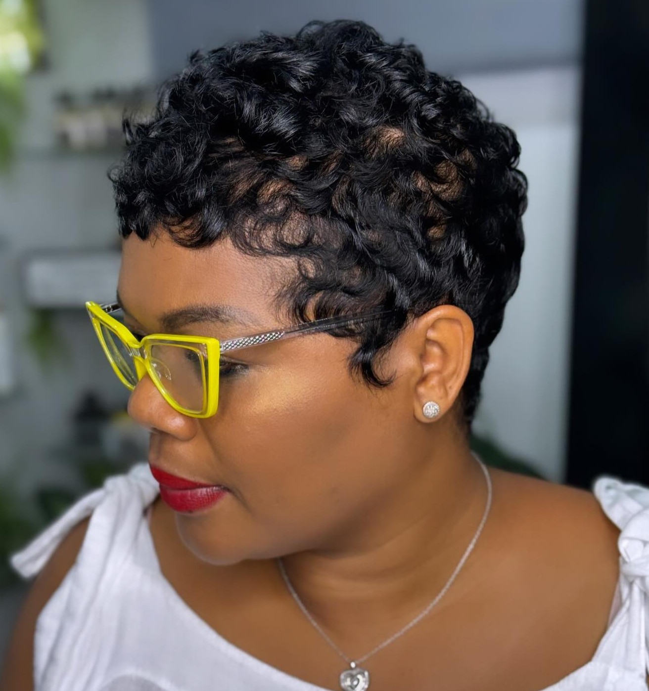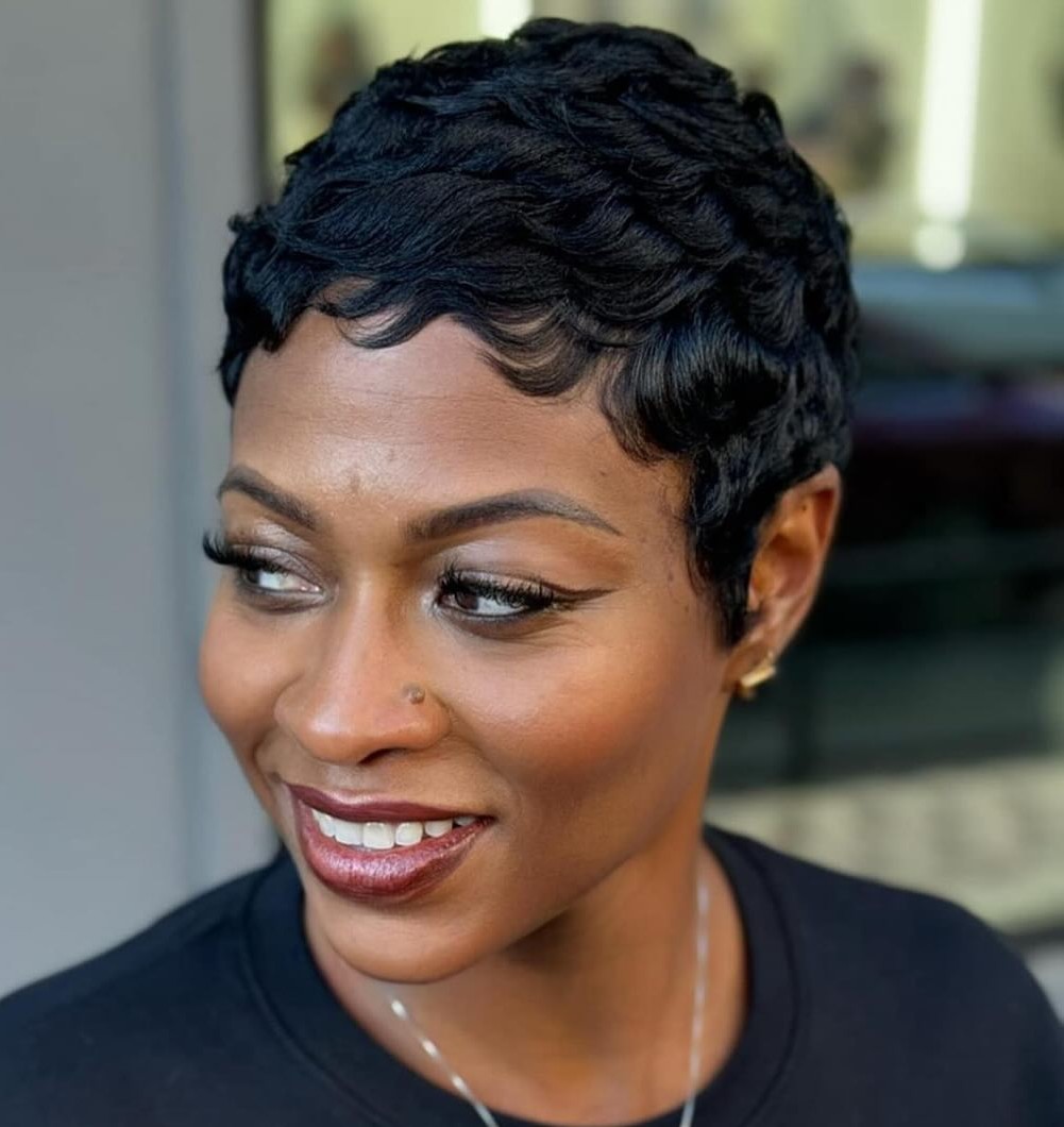 With closely clipped sides and a curly top, this pixie haircut is ideal for a confident black woman. Clean cut to be appropriate for the office, but, clearly, also inviting a party vibe, this hairstyle is given a boost of volume and beautiful, accurate edges.