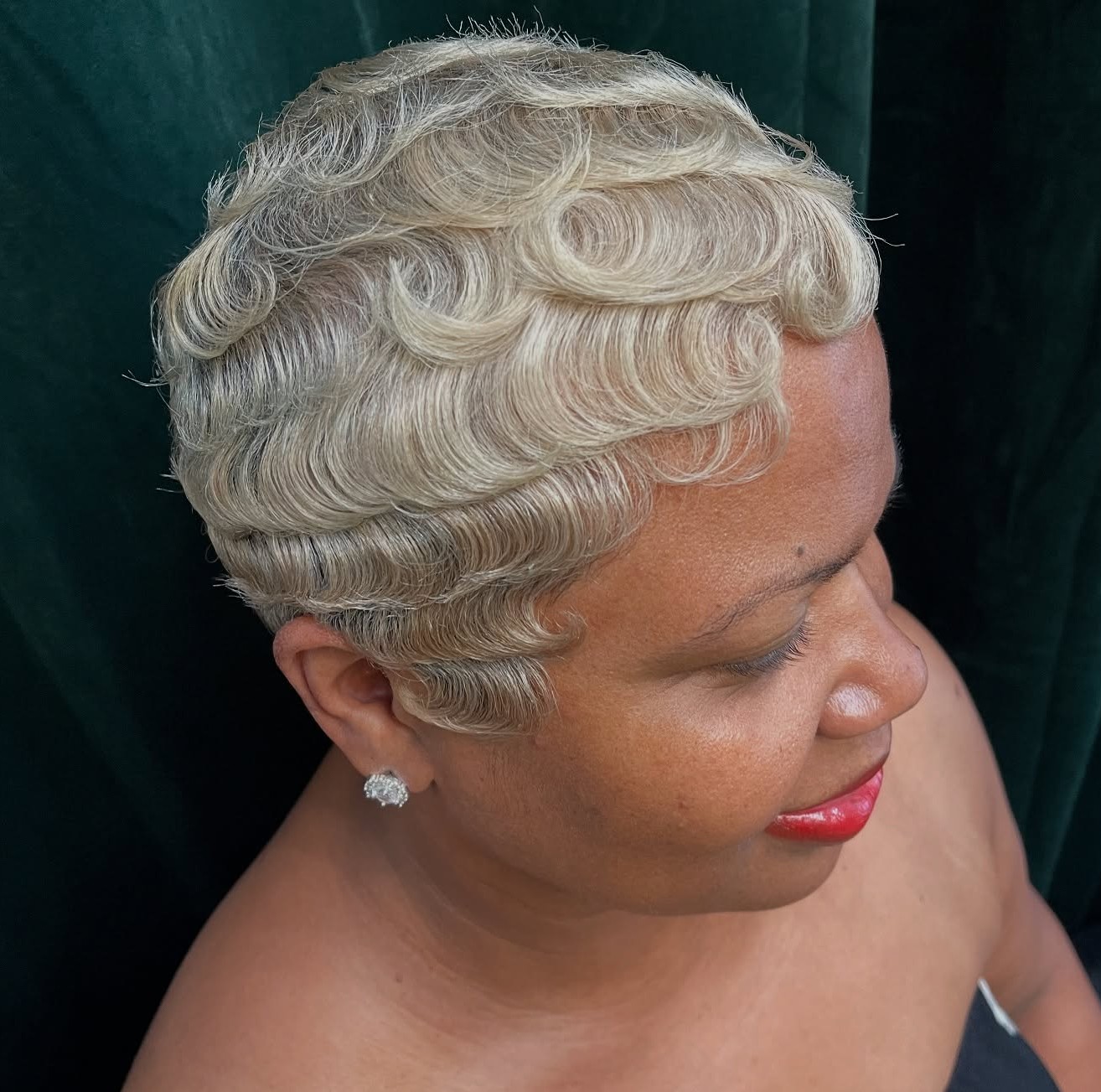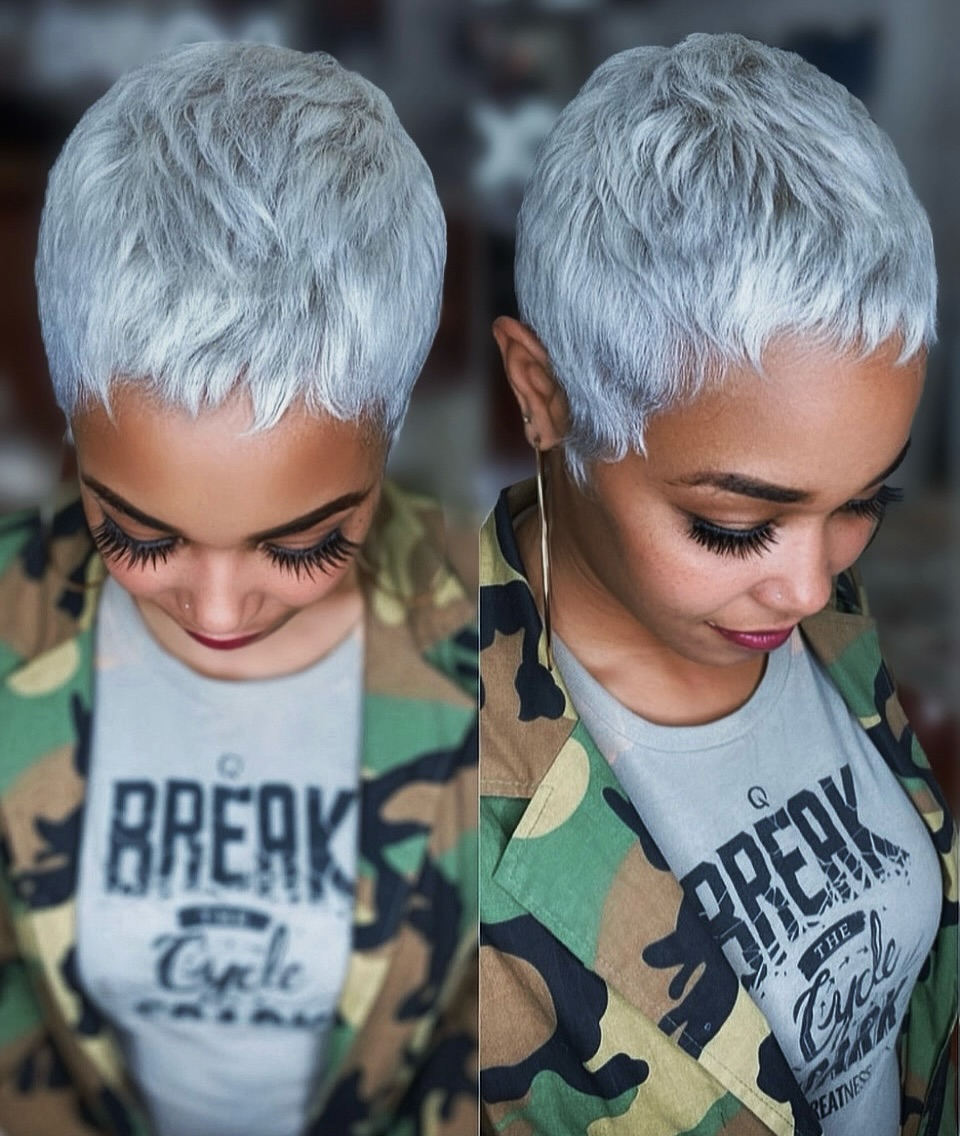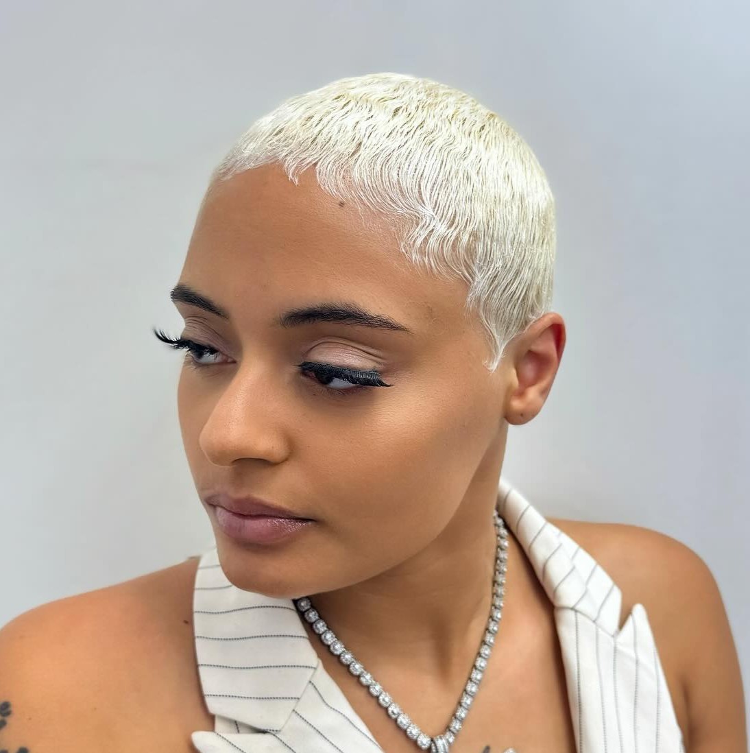 Black women love experiments with blonde hair color. If you want to give it a try too, better pair it with a super short pixie cut like this nearly white stunner. This curly pixie cut with short bangs and a tapered back perfectly frames the face, making you look stylish and sassy.